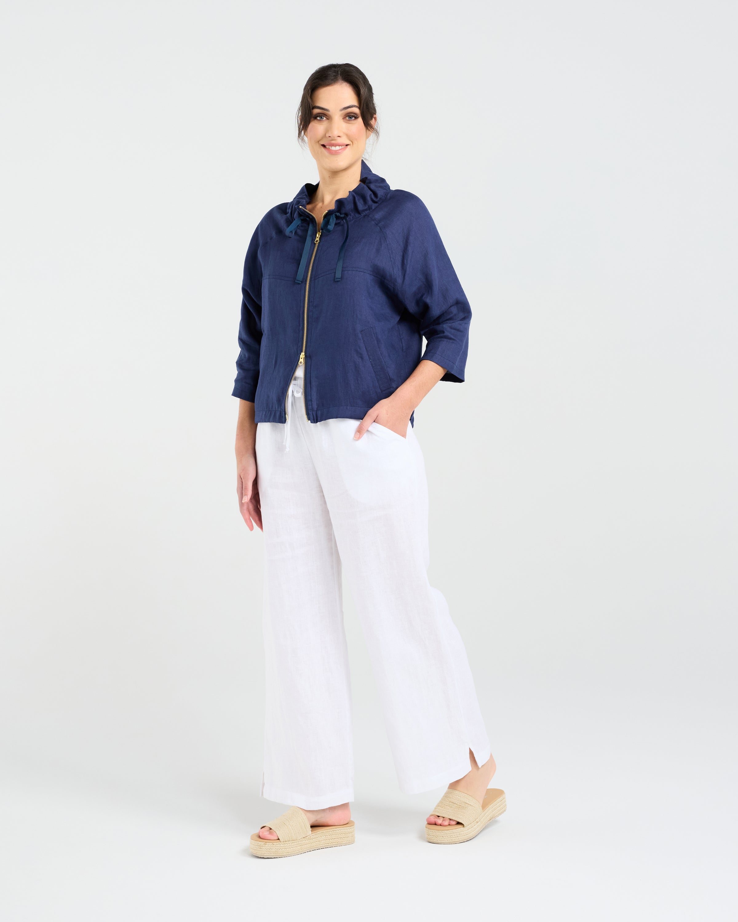 Discover Blackstone's infamous Victoria Zip Front Jacket, a refined embodiment of elegance and utility. Crafted from premium linen, this jacket combines breathability with an impeccably tailored silhouette. Its standout feature, a gleaming gold zip, not only secures the front but adds a touch of luxury to the minimalist design. Perfect for transitioning seasons, the Victoria Jacket is your go-to piece for both comfort and style in one sophisticated package.