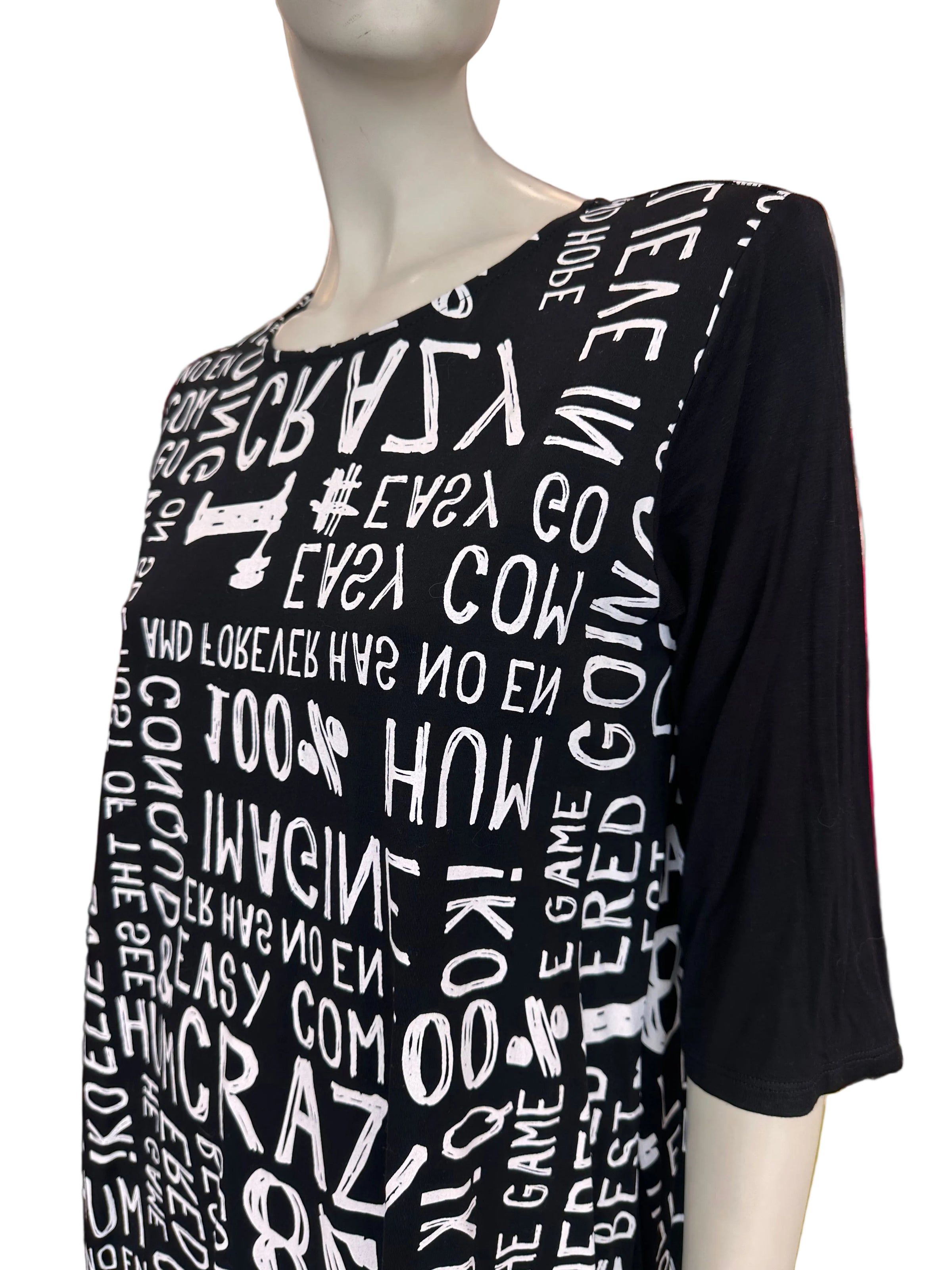 The David Pond Genie Dress combines contemporary style with comfort in a striking black and white colorway. This midi dress features a bold text print, three-quarter batwing sleeves, and distinctive side pocket detailing that elevates the silhouette. Crafted from a luxurious 95% viscose and 5% spandex blend, the fabric drapes beautifully while offering gentle stretch for all-day wearability. The relaxed fit and thoughtful design elements make this piece an effortless choice for both casual and dressed-up occasions.