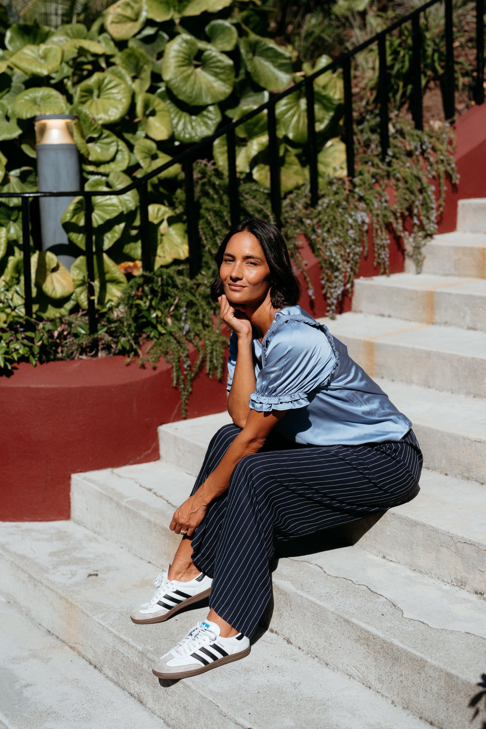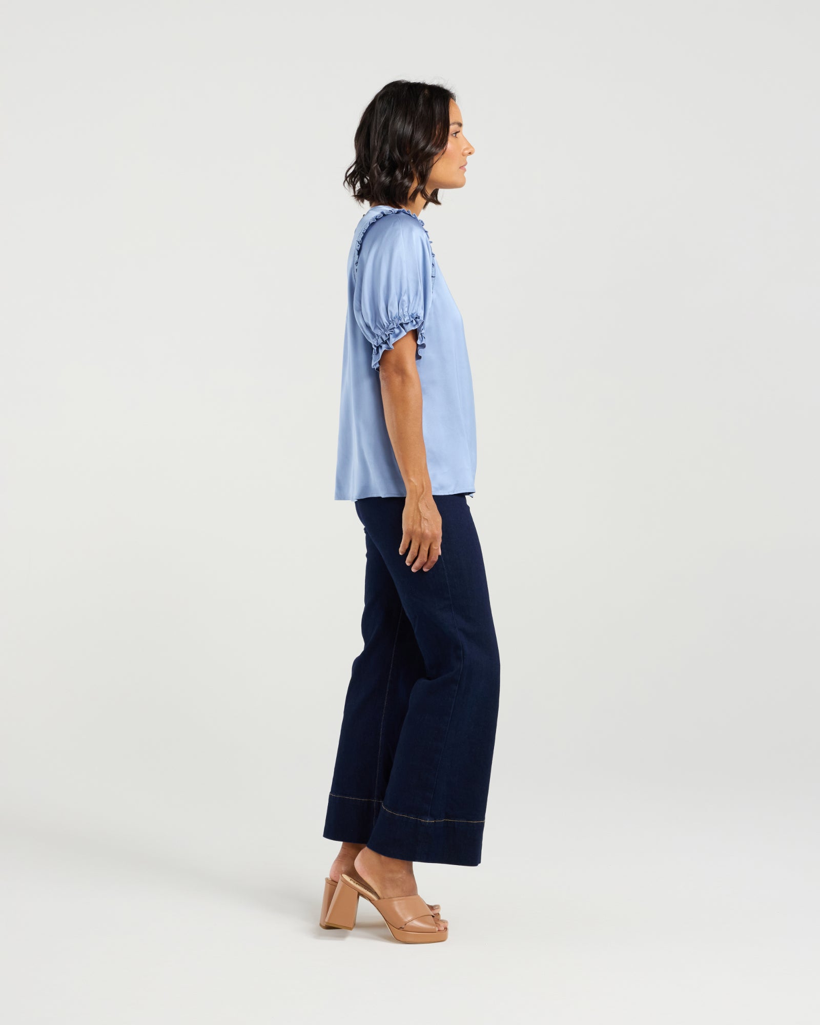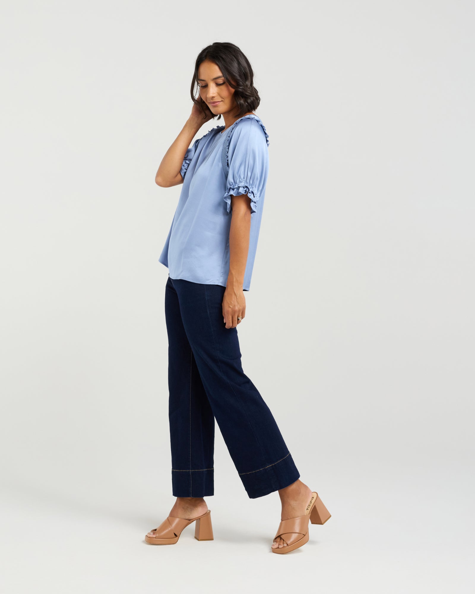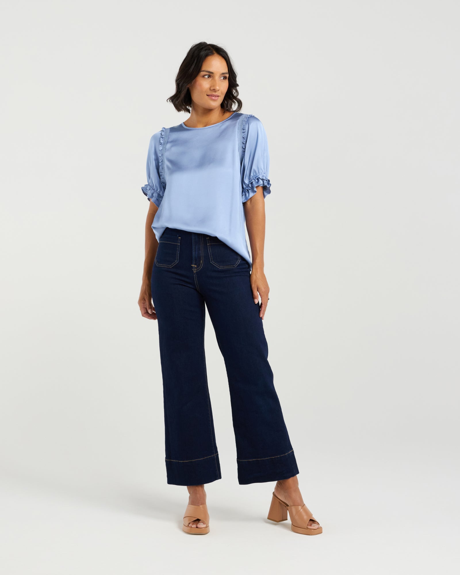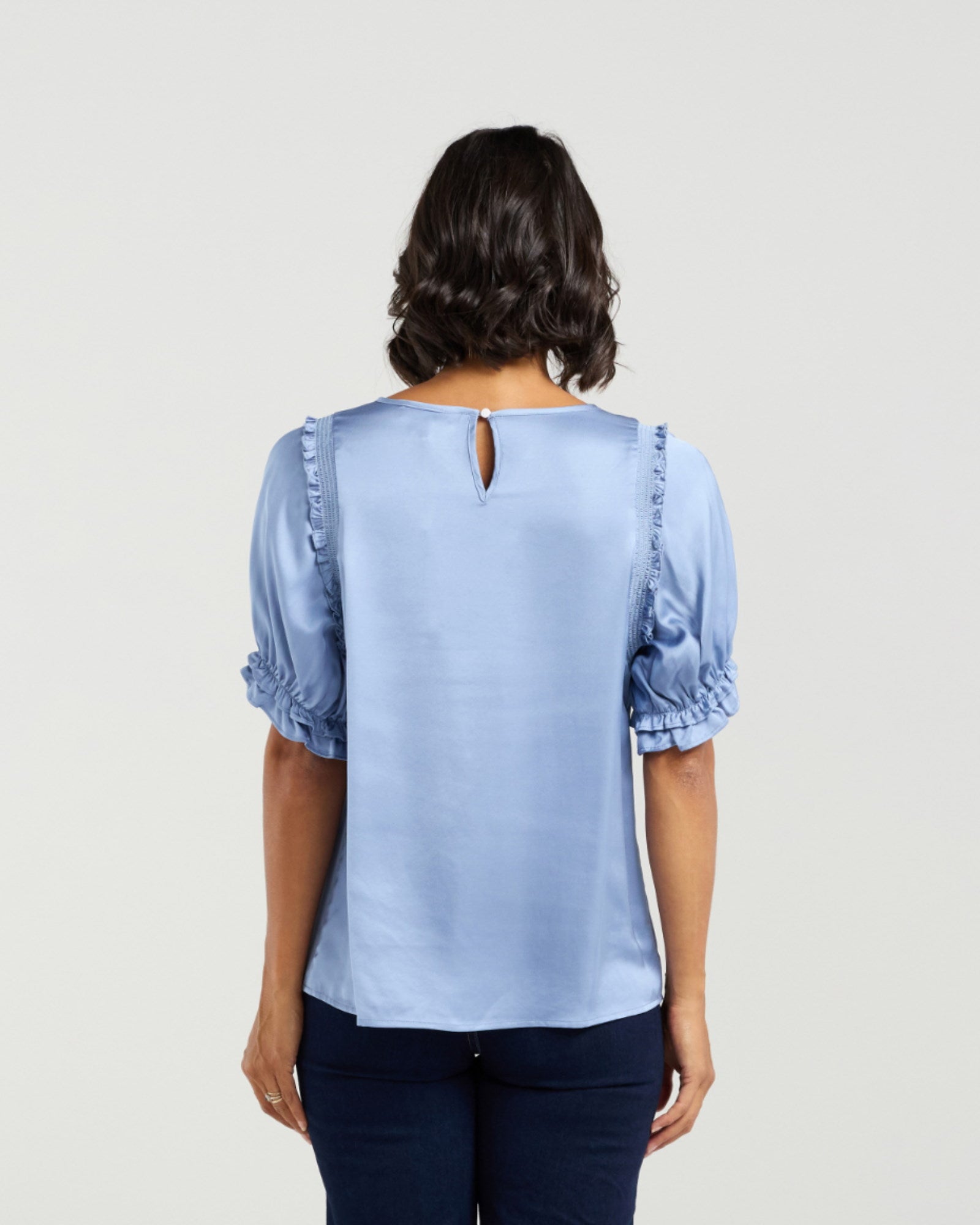 Elevate your everyday with this gleaming viscose-rayon blend top that brings a touch of luxury to any outfit. The smocked frill detailing at the shoulders and short puffed sleeves, adding a playful, feminine flair.. Perfect for pairing with everything from denim to skirts, it’s an effortless way to add a dash of elegance to your wardrobe.