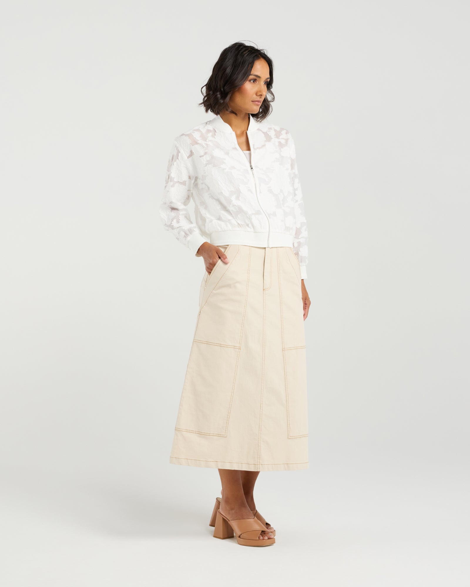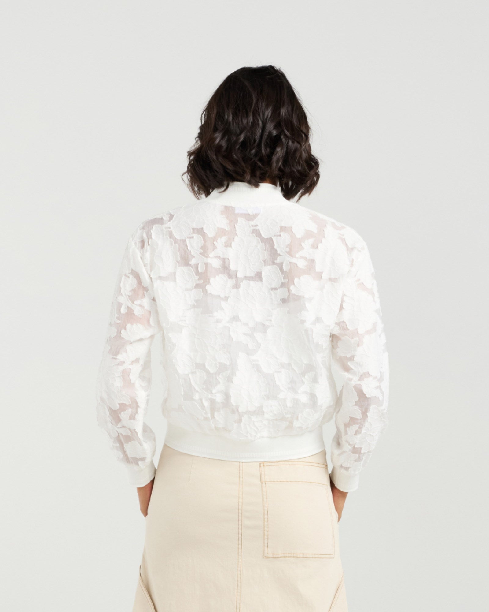 A fresh take on a classic silhouette, this bomber jacket is made in a beautiful burnout fabric that adds texture with a touch of sheer intrigue. The lightweight fabrication is finished with ribbing at the collar, cuffs, and hem band, giving structure to the airy feel of the fabric. Equal parts sporty and sophisticated, it’s the perfect statement layer for day-to-night styling.
