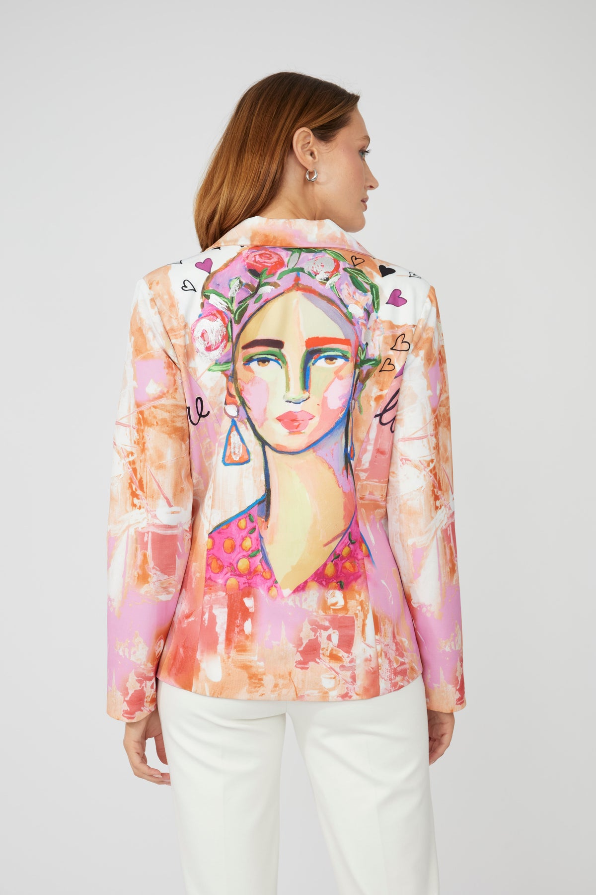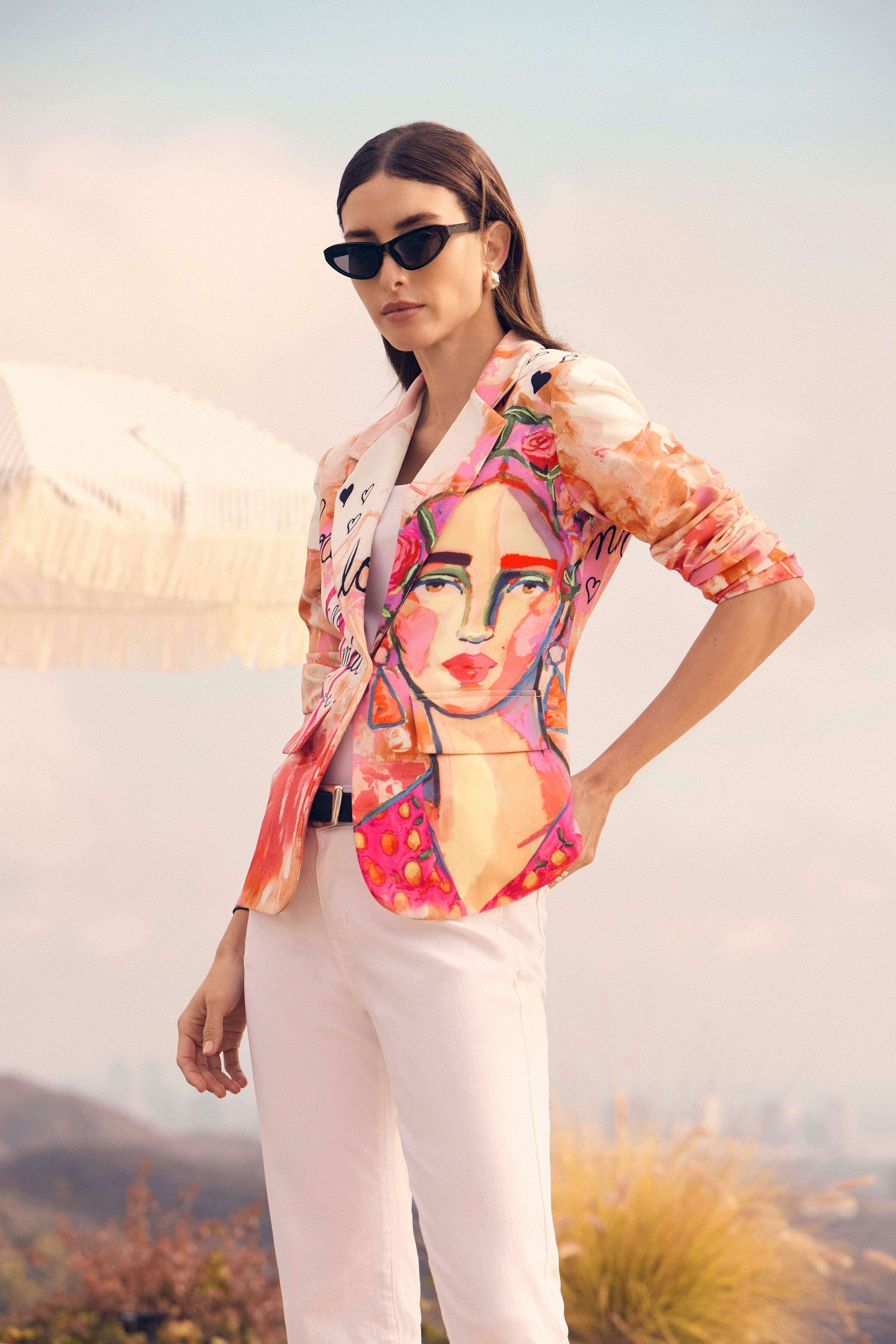 Transform your wardrobe with this elegant Frank Lyman piece. Featuring a button closure and regular fit, this hip-length blazer is perfect for any occasion—be it formal, casual, or office. The notched lapel and long, straight sleeves add sophistication, while the abstract text-print pattern and jewel embellishments offer a unique flair. Ideal for everyday wear, this versatile style combines feminine charm with casual comfort.