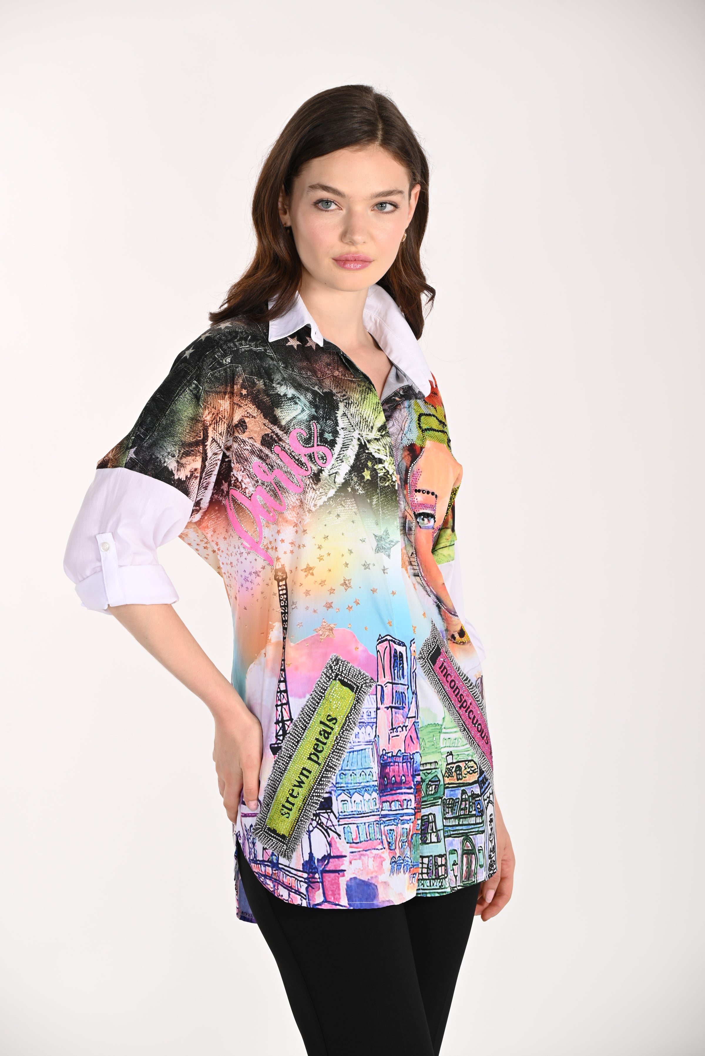 Step into the spotlight with Frank Lyman's chic and trendy clothing item, featuring a button closure and a regular fit that flatters every silhouette. The hip-length design and 3-4 straight sleeves offer versatile styling options, perfect for casual, office, or night out occasions. Adorned with jewel embellishments and a captivating Paris graphic print, this piece ensures you make a bold statement effortlessly.