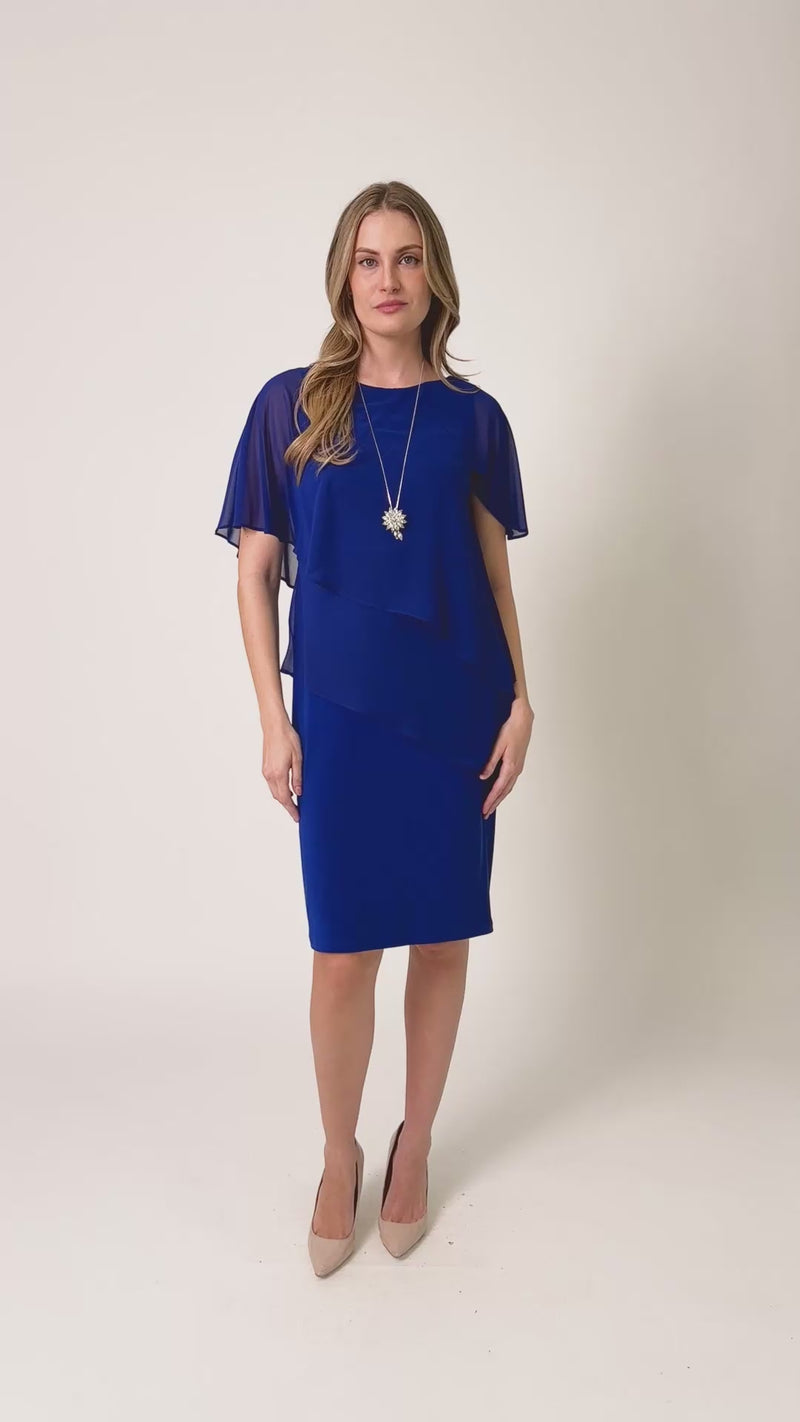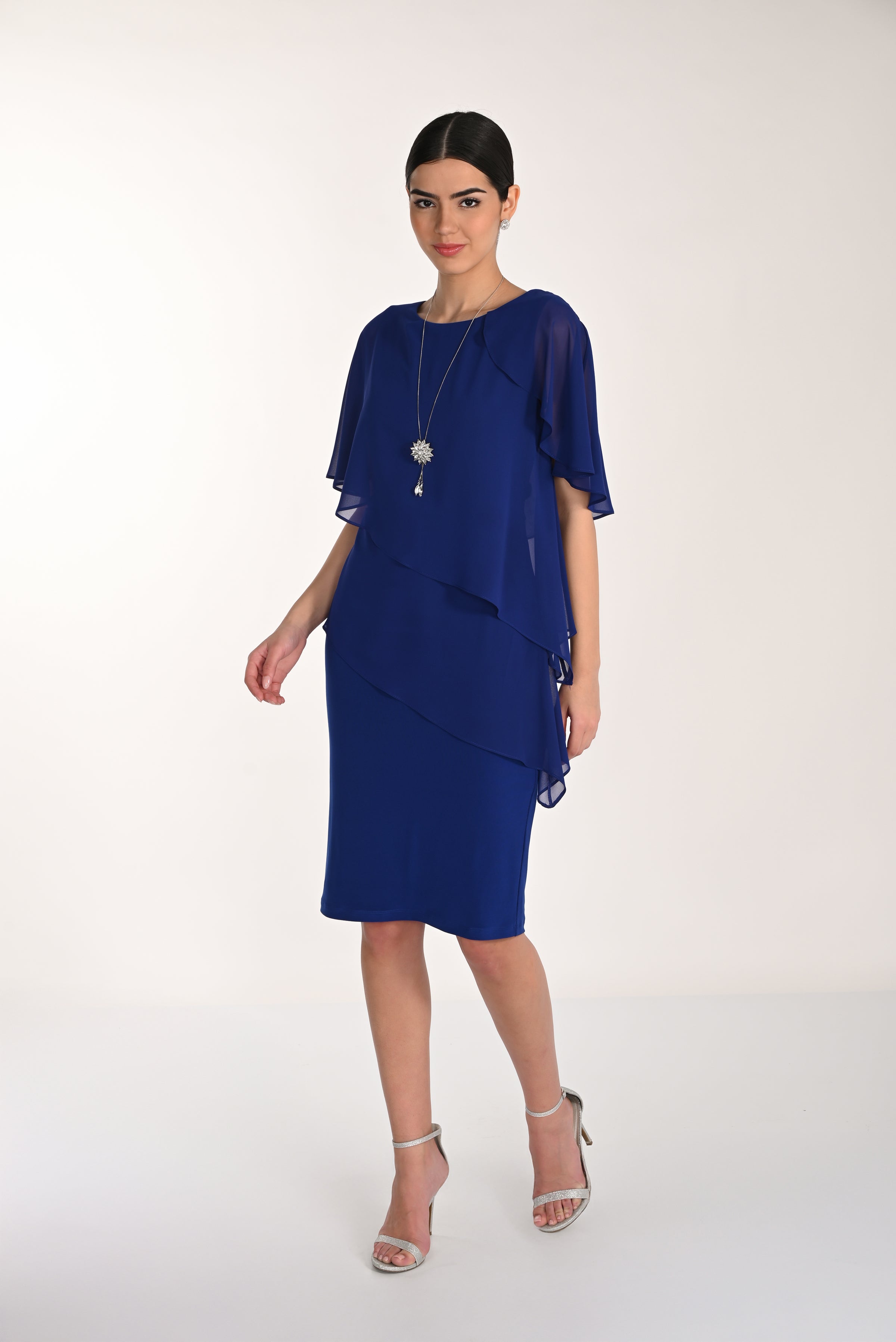 Transform your wardrobe with this stunning knee-length sheath dress from Frank Lyman. Featuring a sophisticated round-neck and flutter short-sleeves, this elegant piece is perfect for both formal and semi-formal occasions. The plain pattern is beautifully enhanced with jewels, layered details, and ruffles, creating a feminine and refined look that exudes elegance.