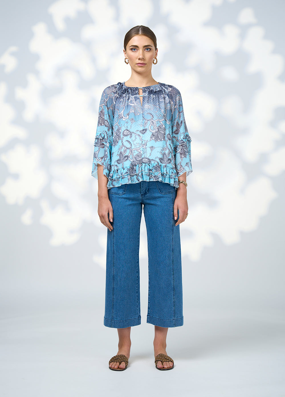 Straight leg jean in a stretch denim with front panel seams and back waist darts for a flattering fit, featuring embroidery details on the pockets.