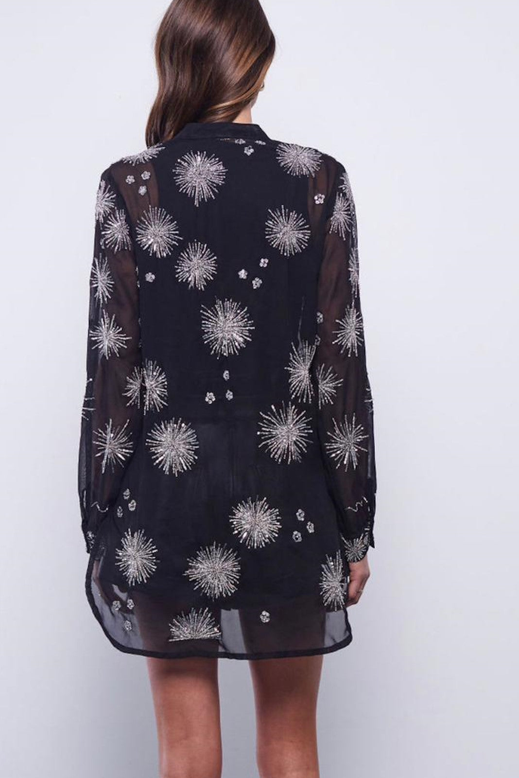 Prepare to shine in this metallic foiled chiffon wrap top, destined for special occasions. The cuffed dolman sleeves and refined wrap silhouette make this piece effortless and timeless.