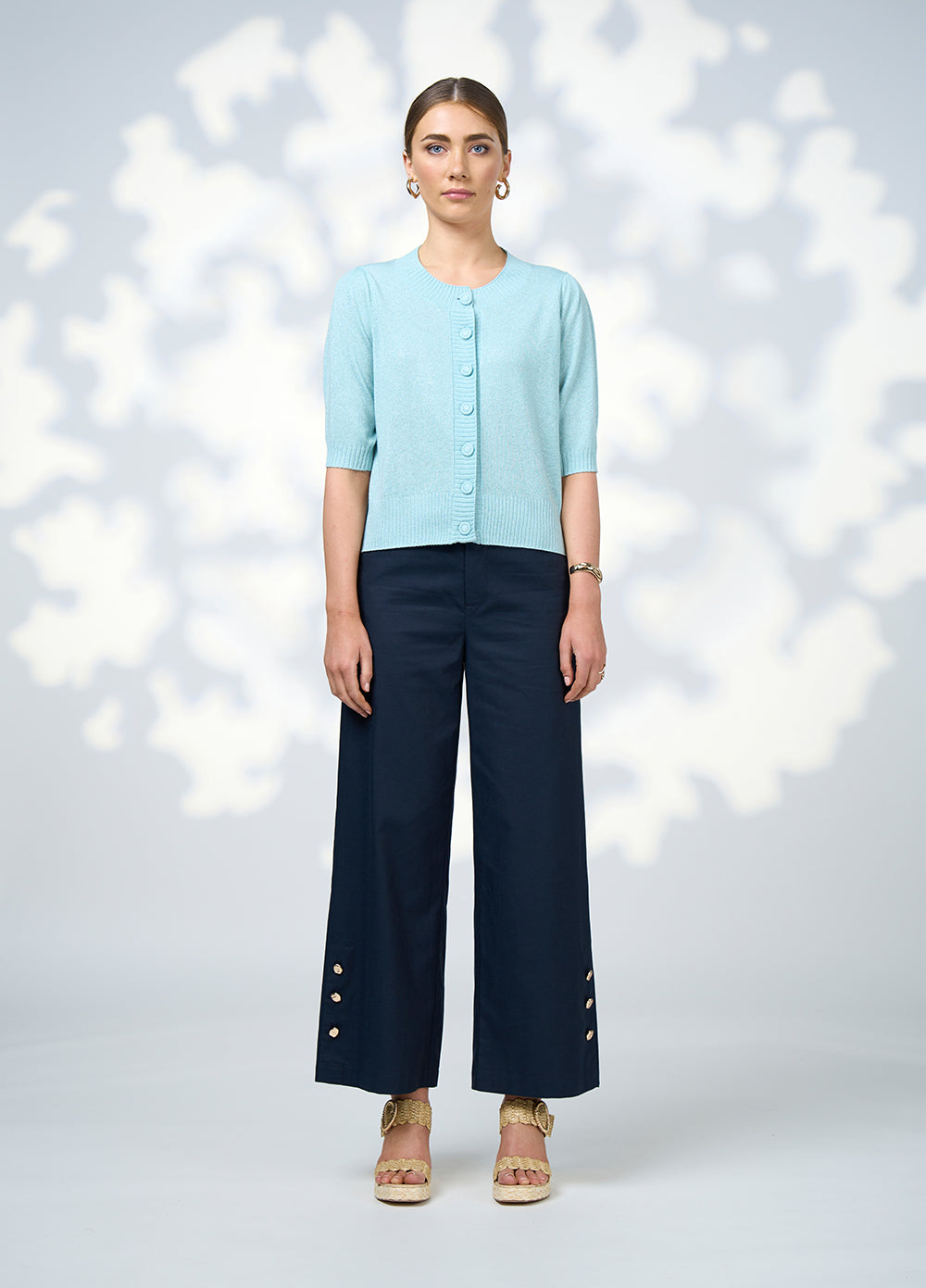 Short sleeve, fitted cardi n a metallic cotton cashmere to add shimmer and elevate your look. Features shoulder tucks to add subtle sleeve volume, self knitted covered buttons and deep ribbing detail.