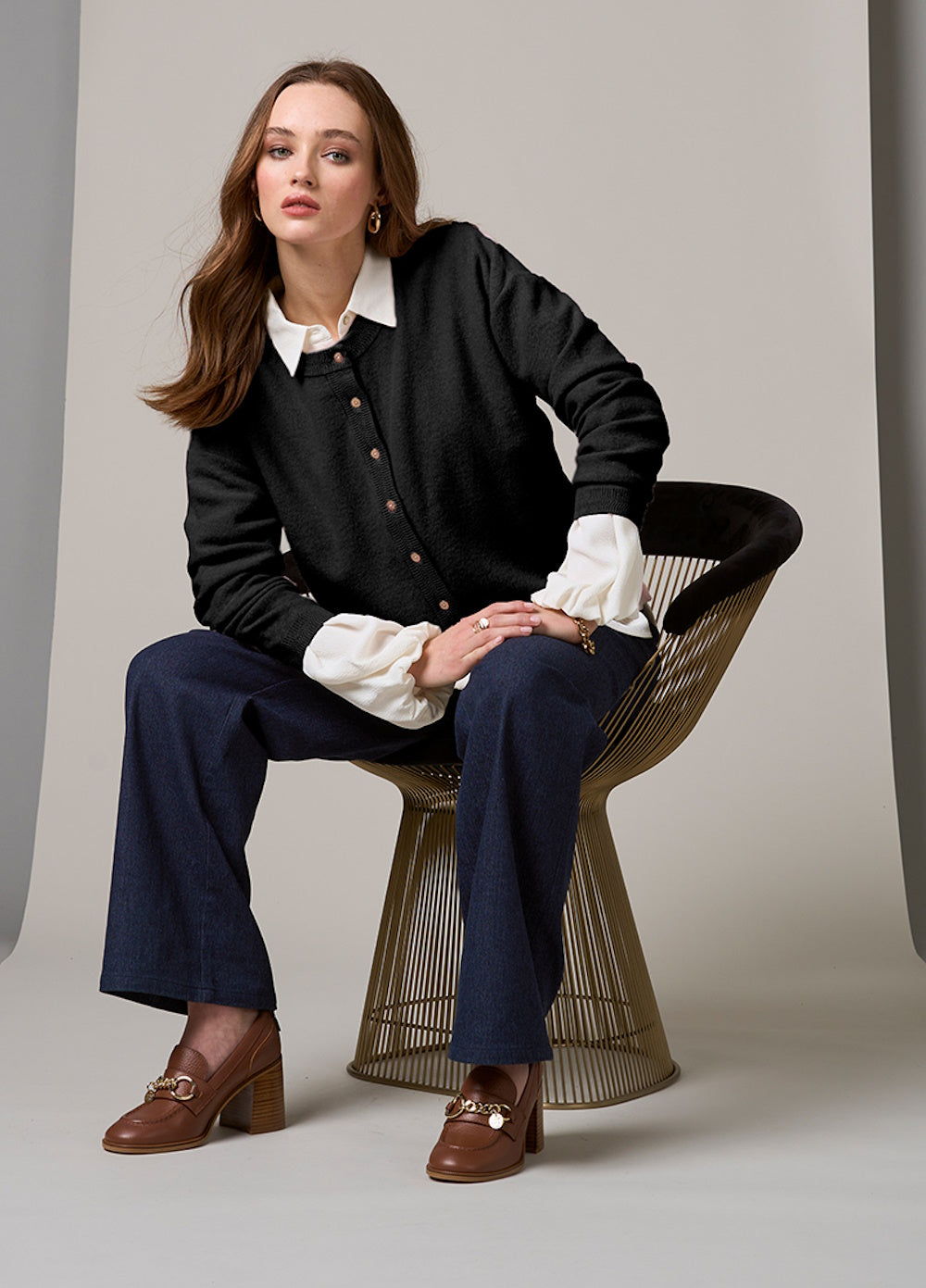 Crew neck cardi knitted in extra soft merino wool, with zig zag rib detail, and textured metal buttons.