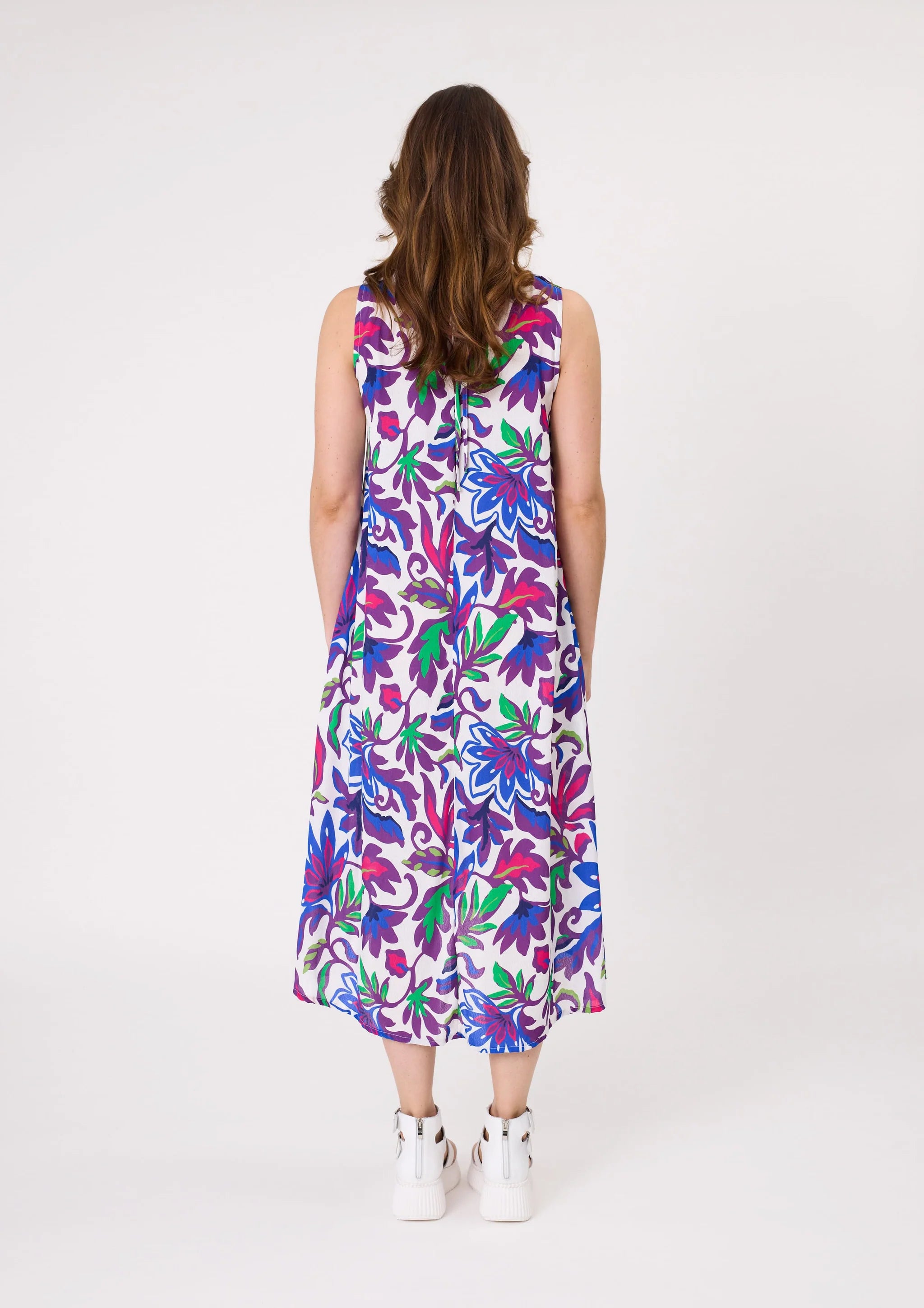 Turn heads in the Ana Dress — a fresh, floral take on effortless elegance. This bold print combines dreamy shades of blue, green, purple, and cerise, bringing a vibrant pop of colour to your wardrobe.