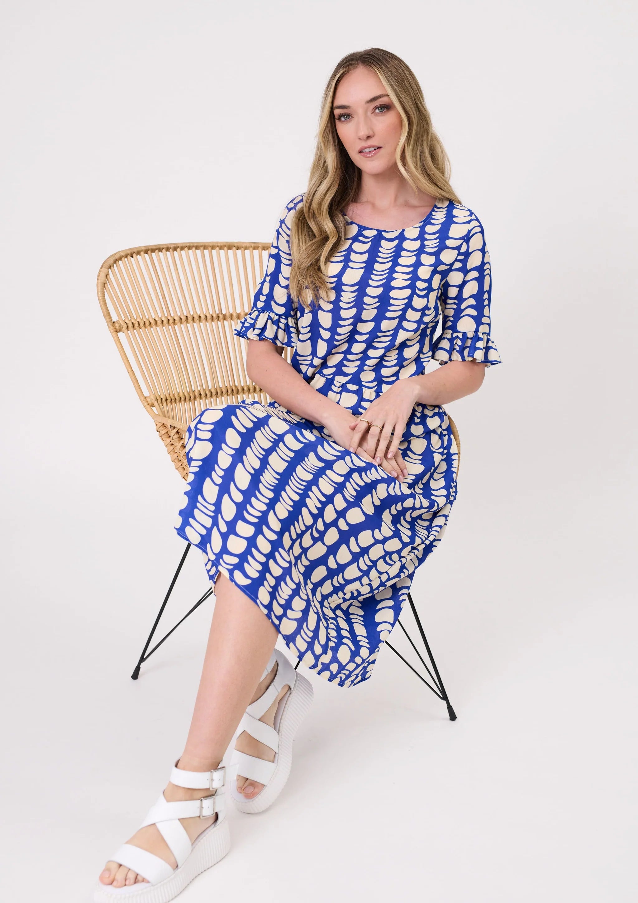 - Features a delicate frill sleeve and flattering midi length.