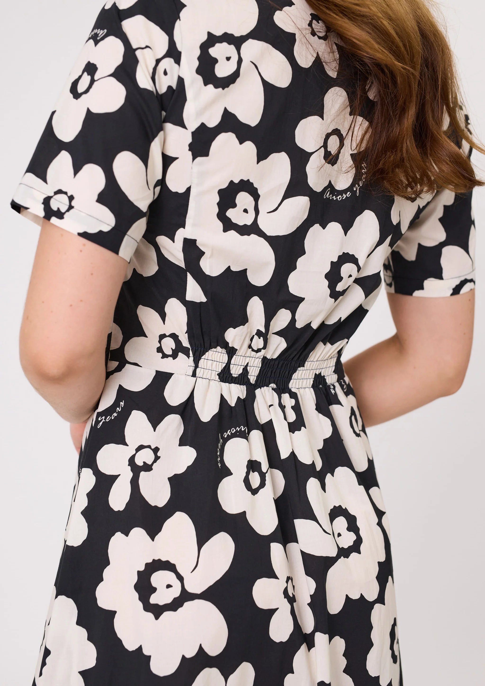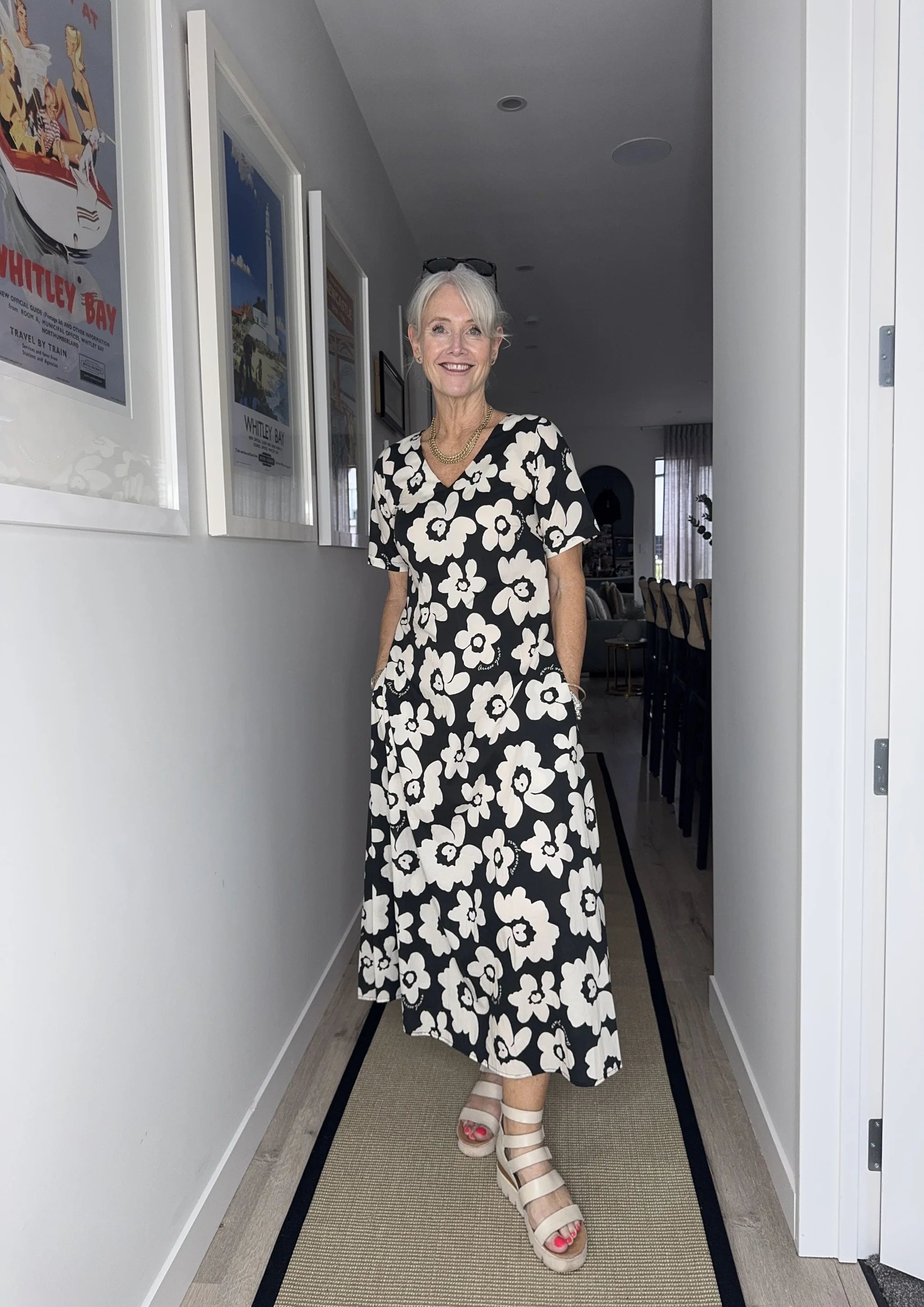 - Features a V-neckline, sleeves, pockets, and a flattering midi length.