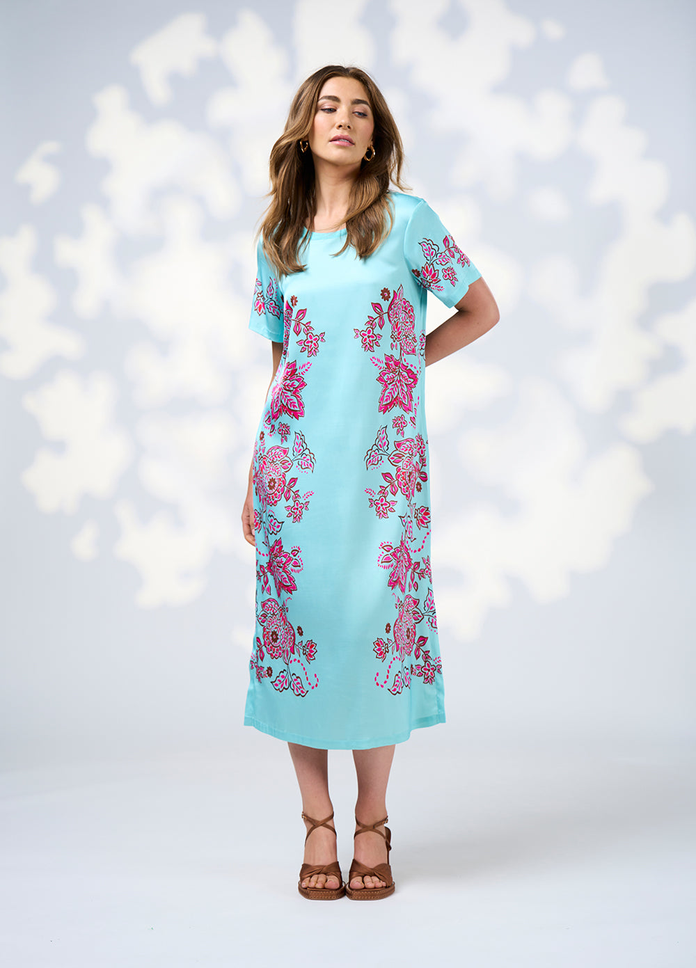 Printed blouse in a silk blend with flounce detail around neckline and through front. Sleeves softly gather into half shirred elasticated cuffs. Featuring bust darts and side splits for the perfect fit.