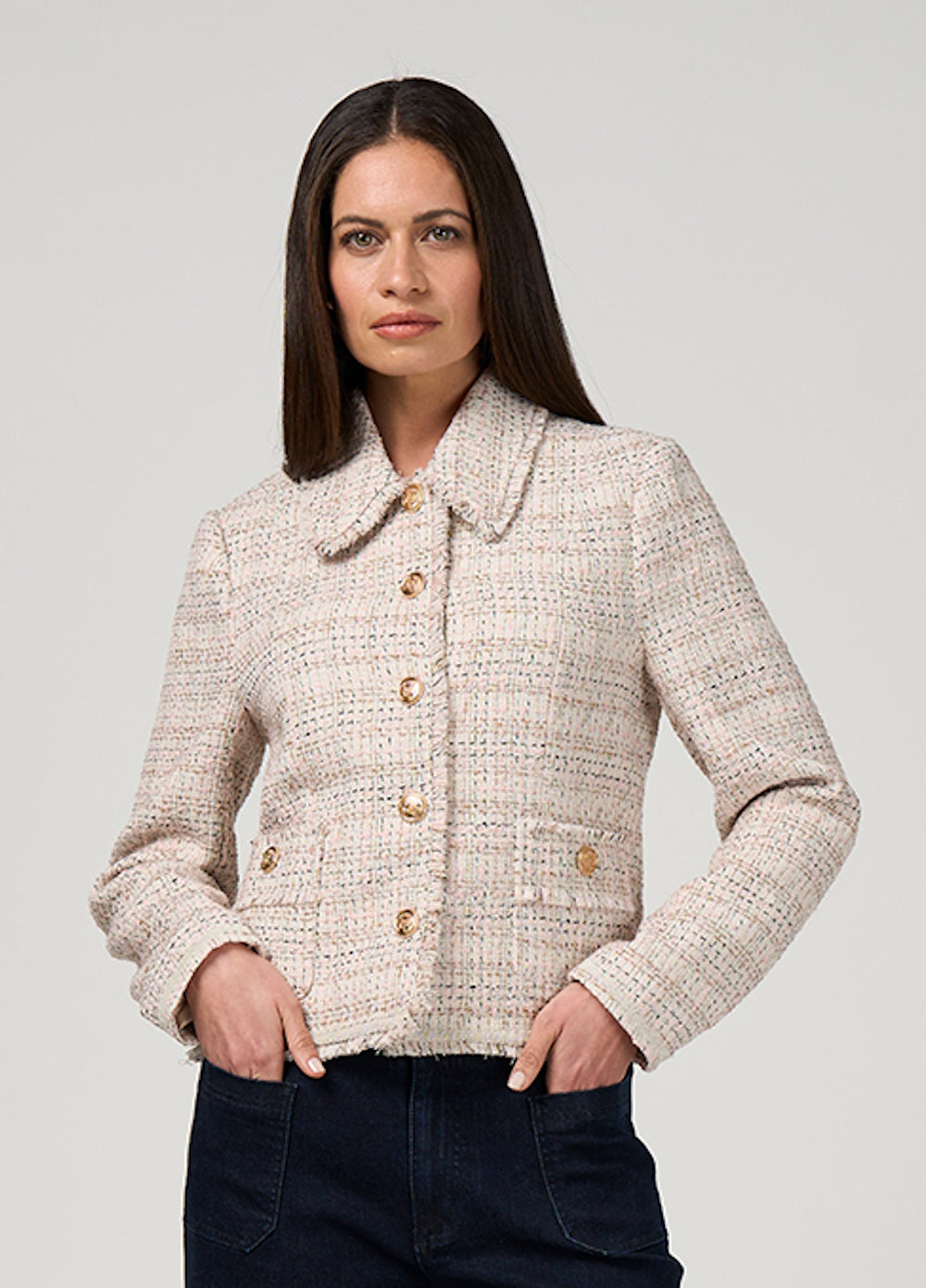 Fitted bouclé short-line jacket with a structured collar, princess panel seams, and patch pockets. Featuring frayed edges, tonal braid trimming, and soft matte gold shank buttons. Fully lined.