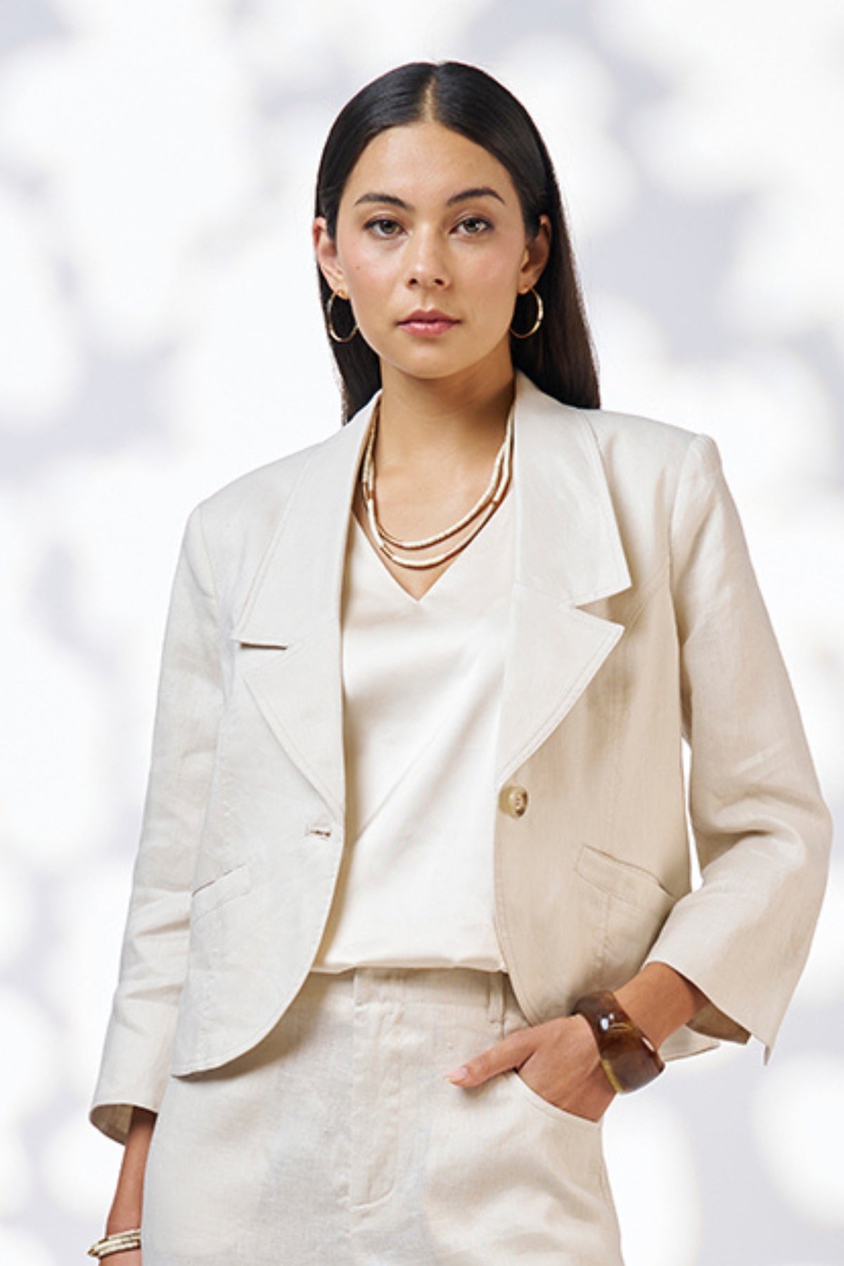 Cropped, linen jacket with a back peplum and rounded front hem. Statement embroidery adds detail and elevates the styling.