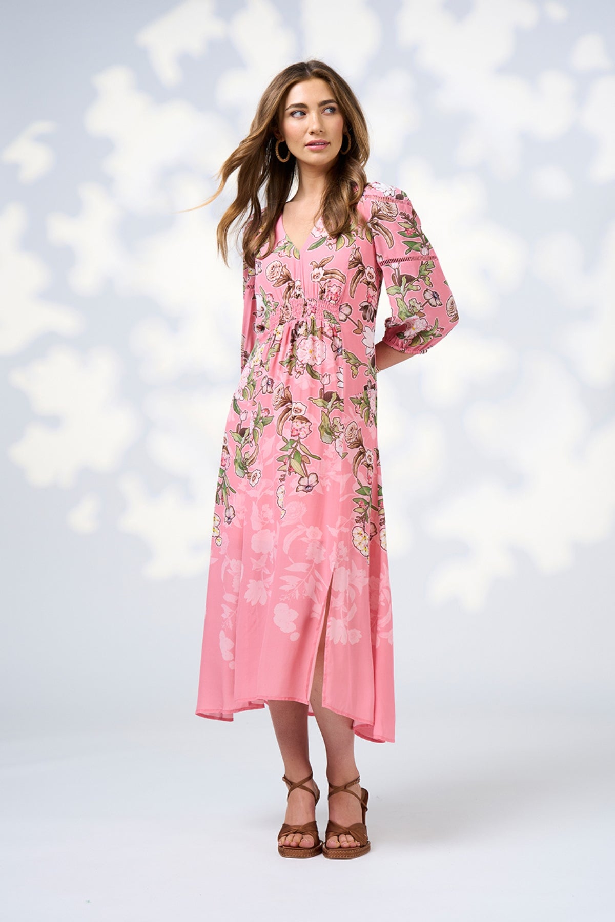 Printed midi dress with a V neckline with princess panels, and splits at front seams. Featuring inserted lace ladder trim on sleeves and shirring detail under bust and back waist, with elasticated cuffs. Fully Lined.
