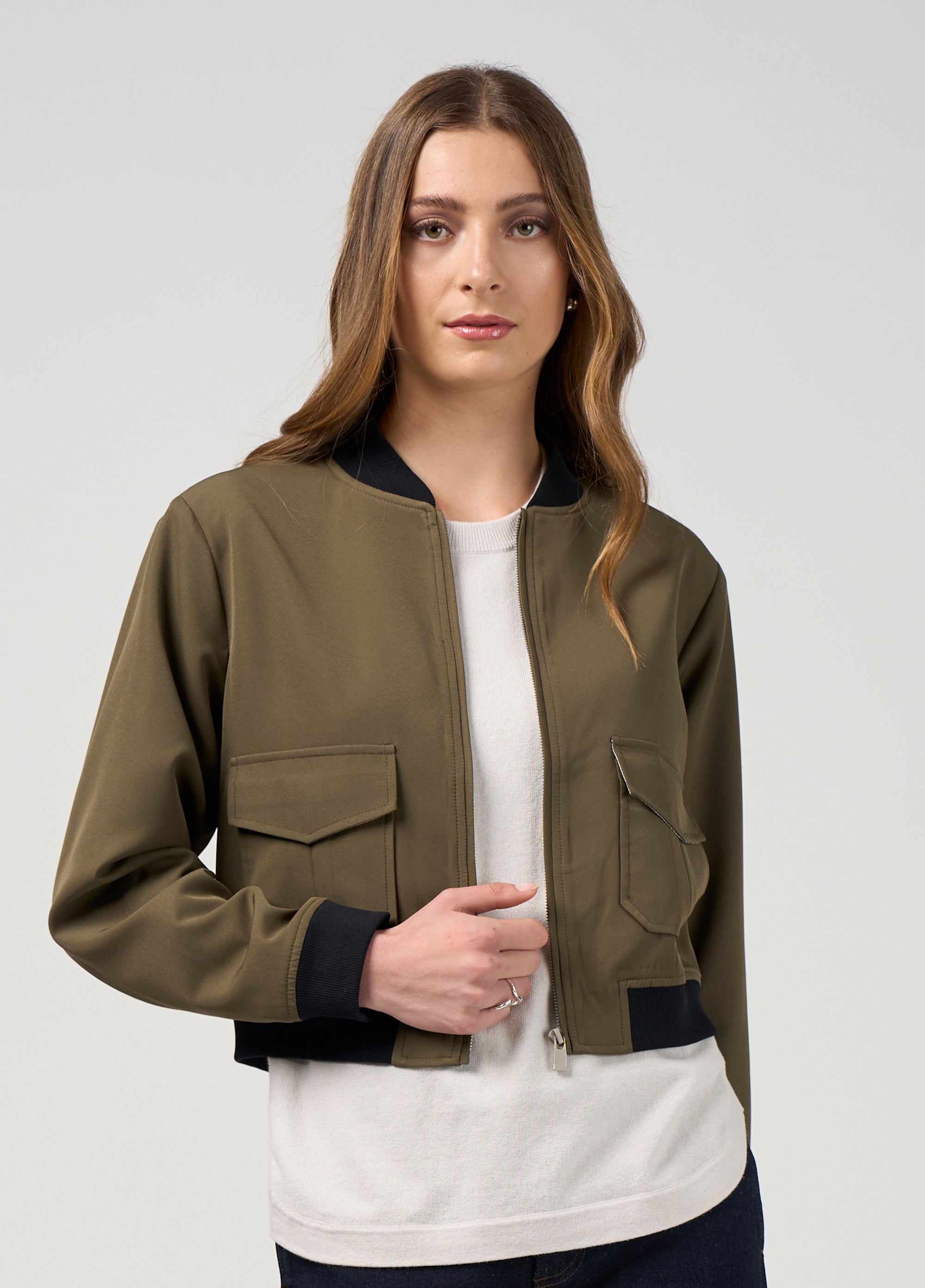 Bomber jacket with a zip front, and front pockets, accessible from the side with top flaps and cutaway corner detail, featuring rib detailing on the neck band, hem and cuffs.