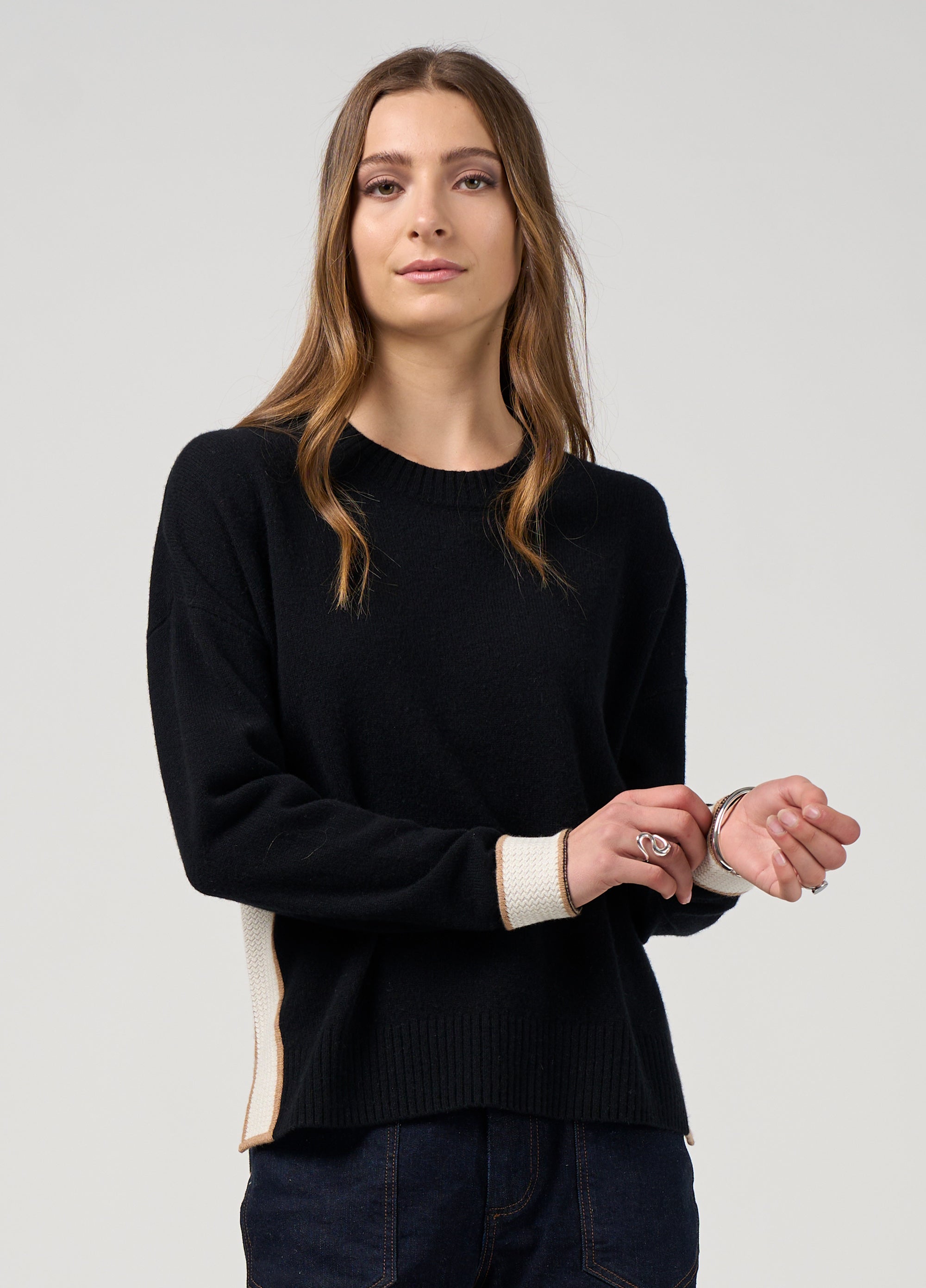 Crew neck sweater in a super soft merino-cotton blend, featuring a textured stripe detail at the side seams and cuffs.