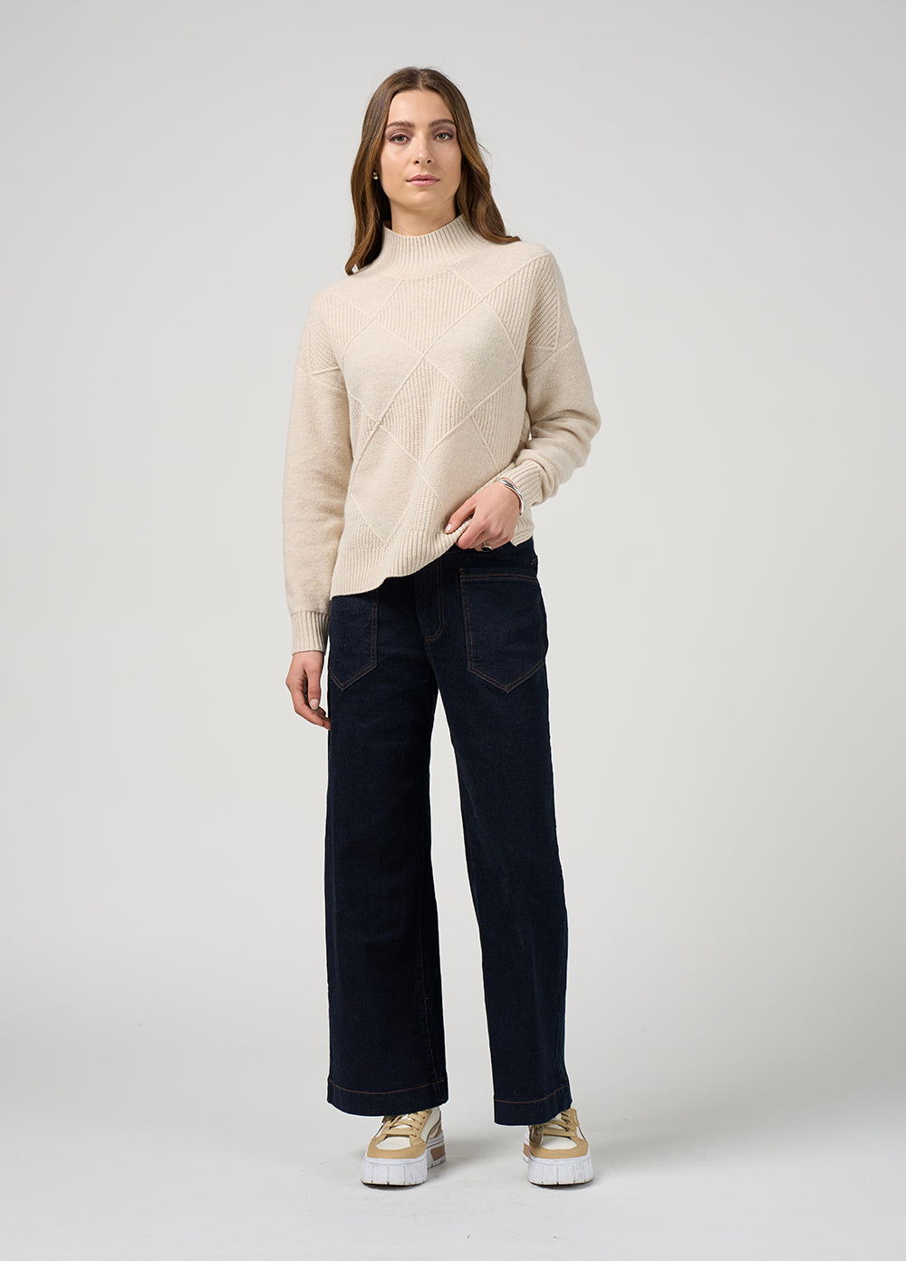 Knit sweater featuring a diamond checkerboard pattern with contrasting jersey and reverse jersey, featuring raised textural lines.