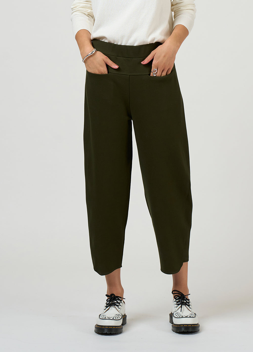 Pull-on ponte pant with a tulip style shape, featuring cropped side panel inserts and front pockets into the yoke seam for a sleek, modern look.
