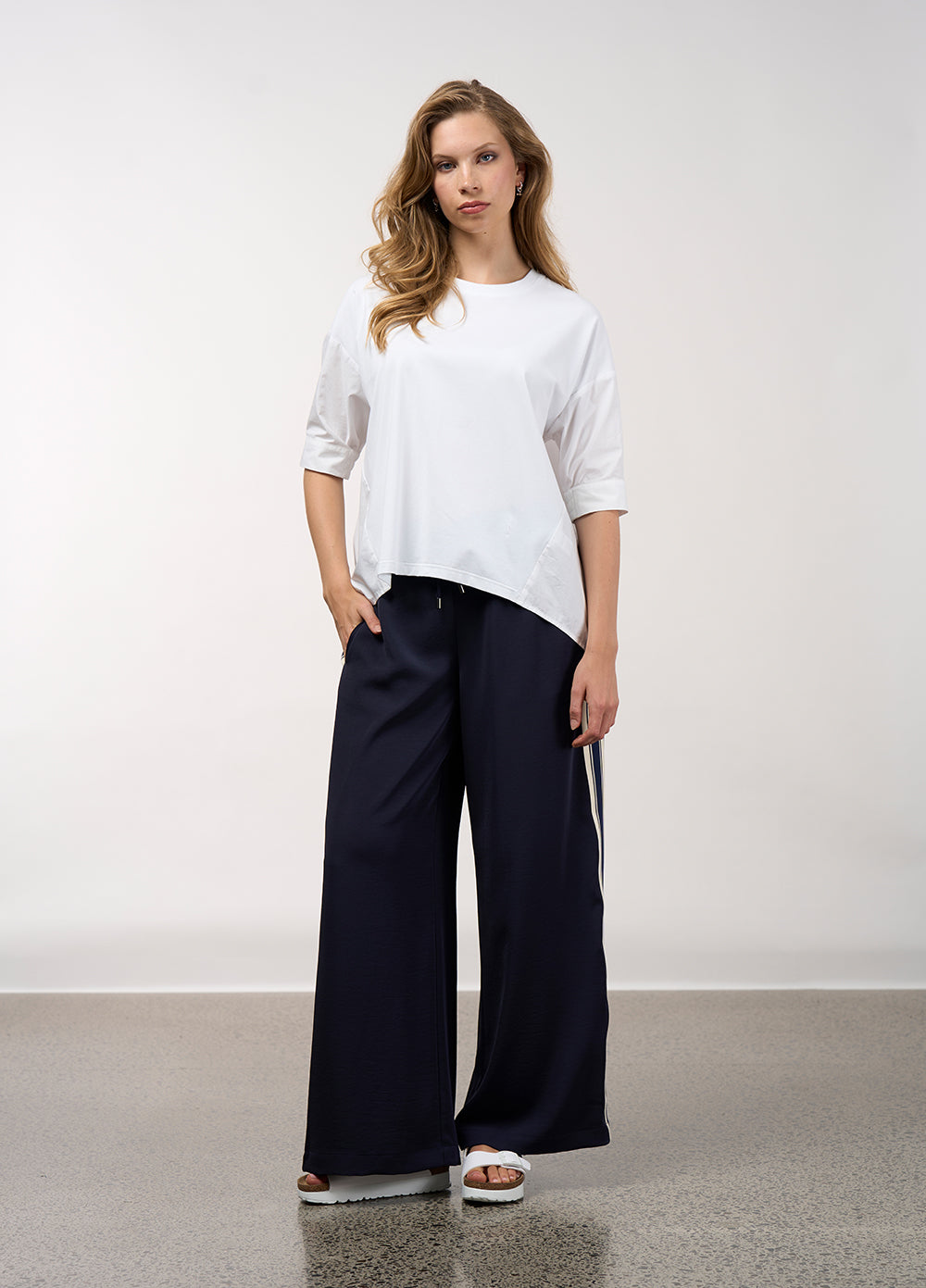 Relaxed fitting wide leg pant, with an elasticated waistband and ties for the perfect fit. Featuring a wide striped tape trim at side seams for a sporty look.