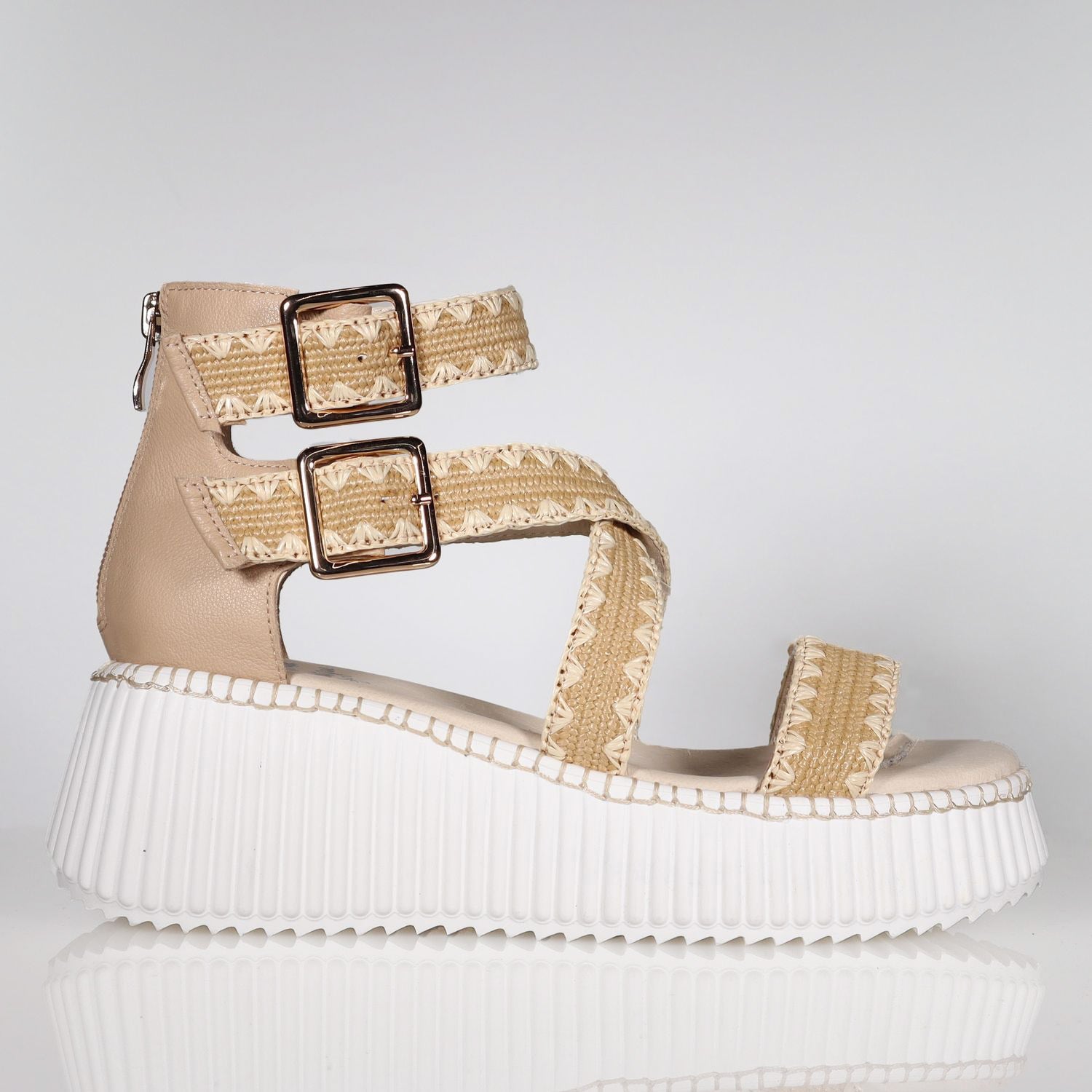 The new season of a summer favourite, Plaza Woven brings a textural twist to our must-have platform sandal. Set on the ultra comfortable lite weight Boost ridged sole, it offers the perfect lift for all day wear. The strappy raffia woven upper adds artisanal charm, finished with buckle details, tonal stitching, and a back zip for easy on and off. Available in Nude Raffia, Plaza Woven is your go-to for sunshine ready style whether you're heading to brunch, the beach, or the vineyard.