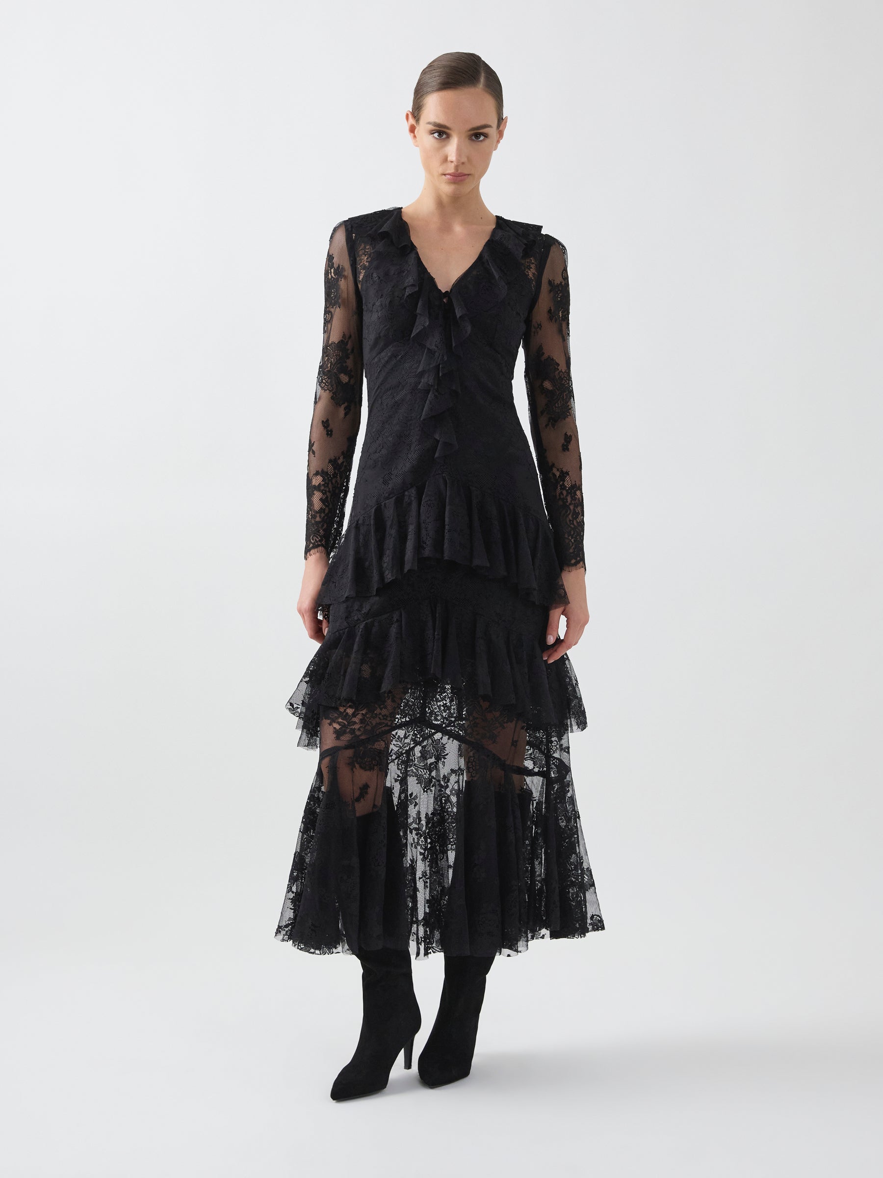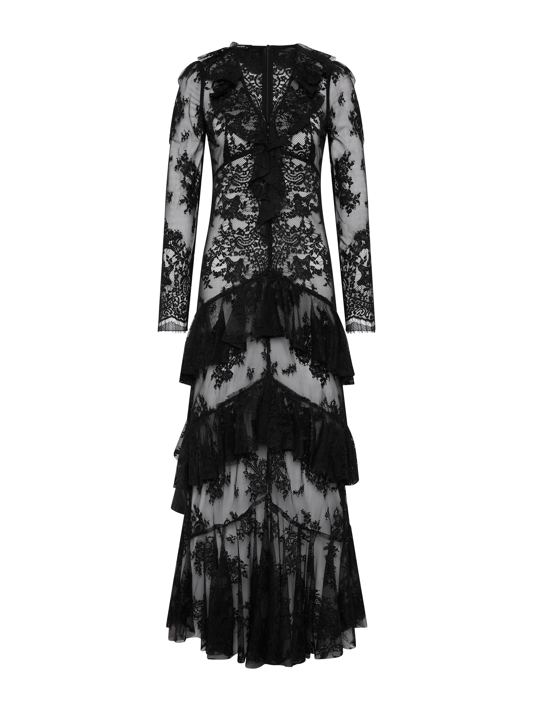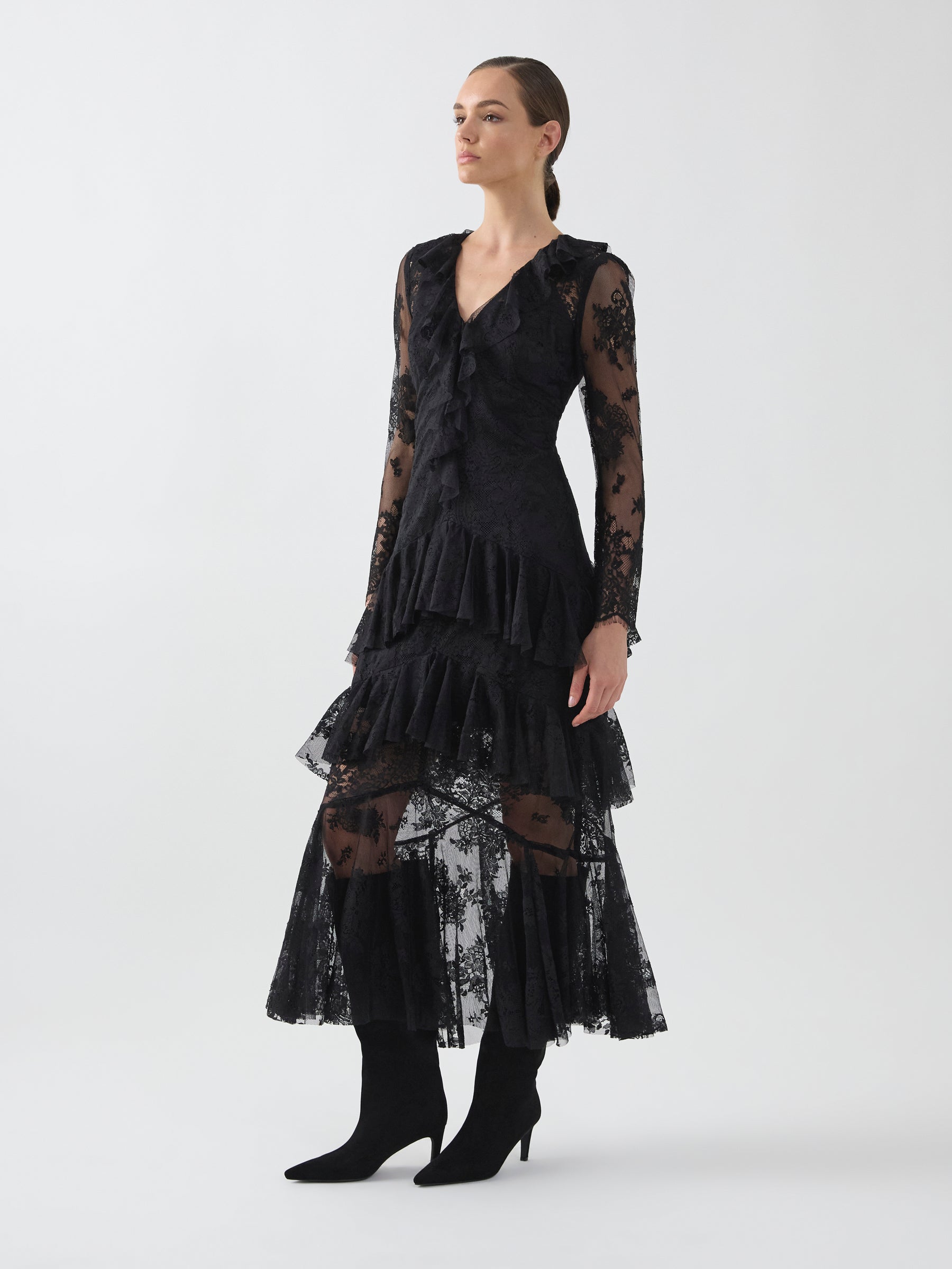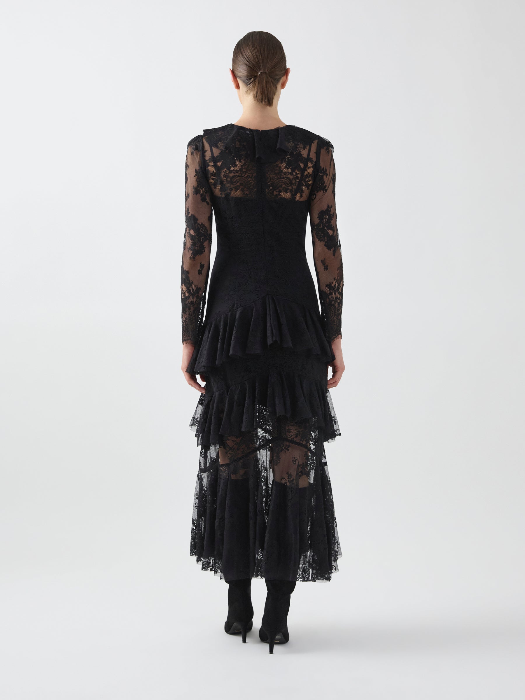 Delicate and expressive, the Antoinette Dress is crafted from black scalloped lace with cascading frill detailing. The silhouette moves into a soft full-length skirt, creating fluidity and depth. Designed for day-to-evening wear with a romantic finish.
