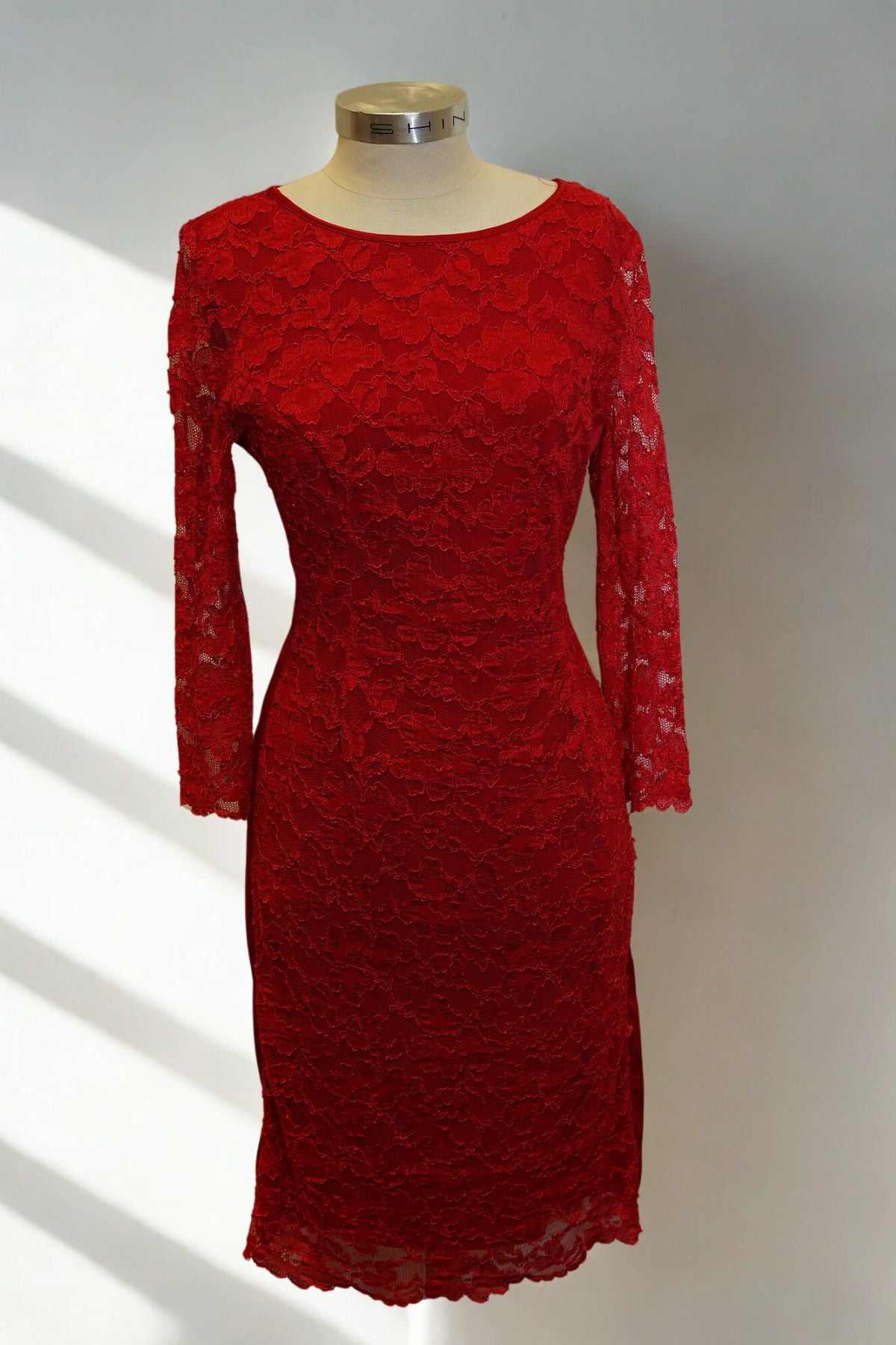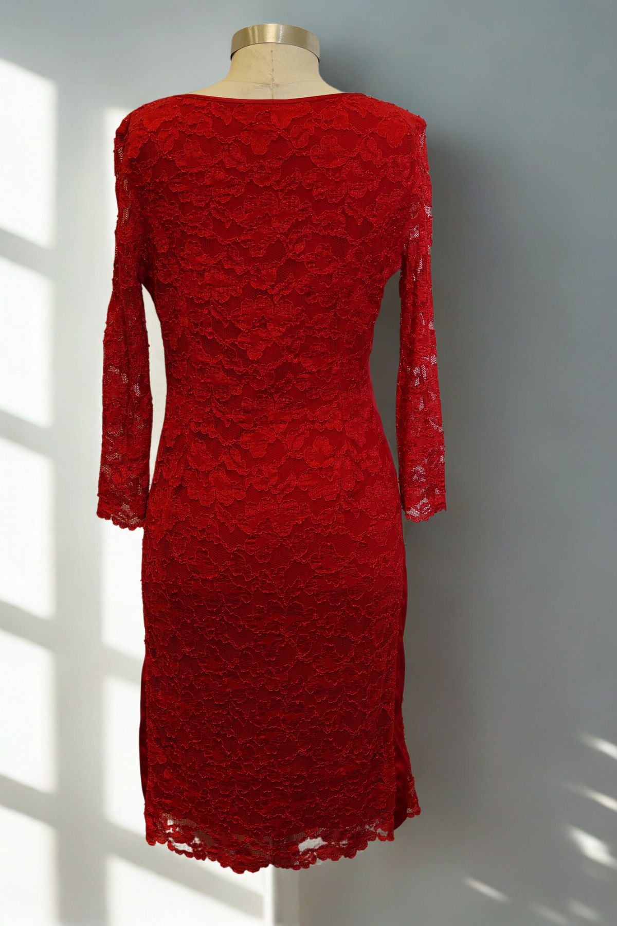 This red cocktail midi dress features intricate lace with sheer mesh detailing, creating a refined yet sultry silhouette. Satin side strips add a sleek, sculpting effect, while the stretchy fabric and midi-length sleeves ensure a comfortable, flattering fit. Perfect for evening soirées, romantic dinners, or any occasion where elegance is a must.