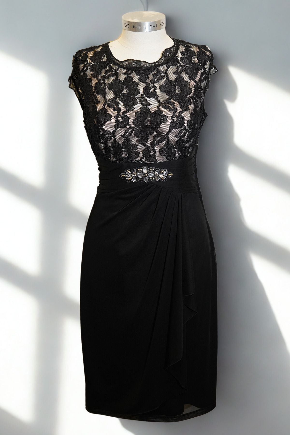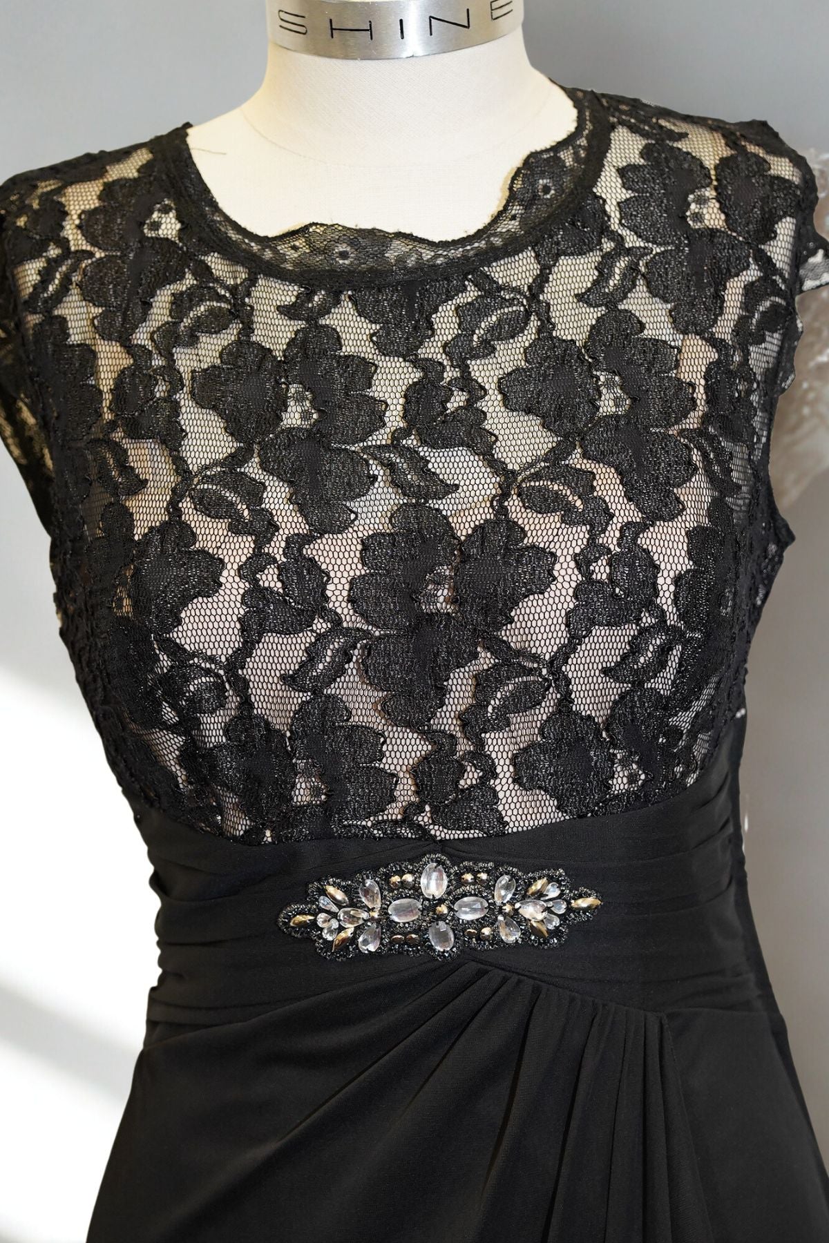 This dress is designed to flatter from every angle. Featuring delicate lace detailing and a shimmering diamanté waistline, it strikes the perfect balance between elegance and allure. The beige inner top is seamlessly connected, adding contrast and coverage beneath the sheer lace bodice. Ideal for cocktail parties, formal dinners, or special evenings out.