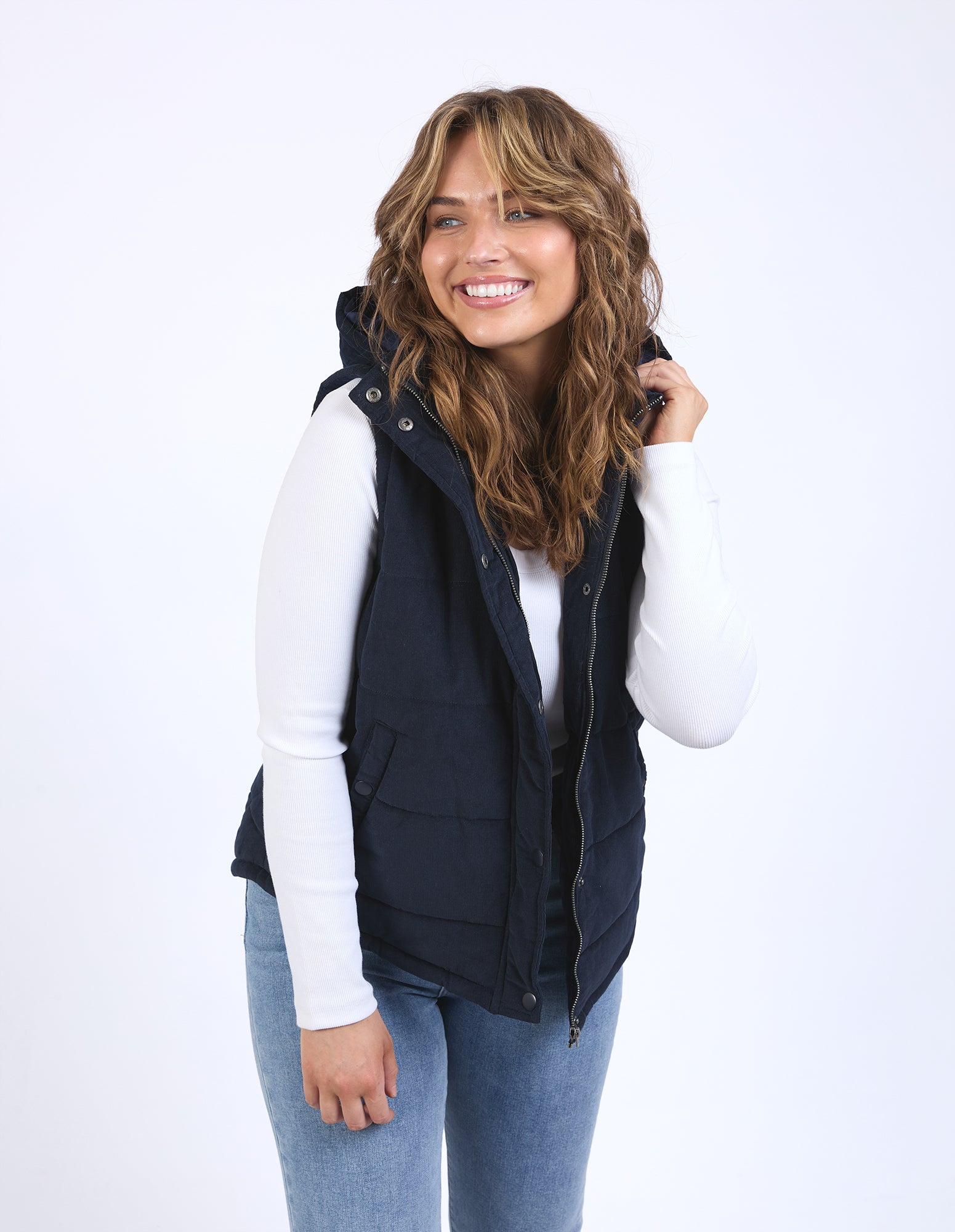 The Elm Cord Puffer Vest is a cosy layering essential with practical detail. Designed in soft cotton cord, it features a detachable hood, metal snaps and zip closure, and a relaxed fit for easy wear.
