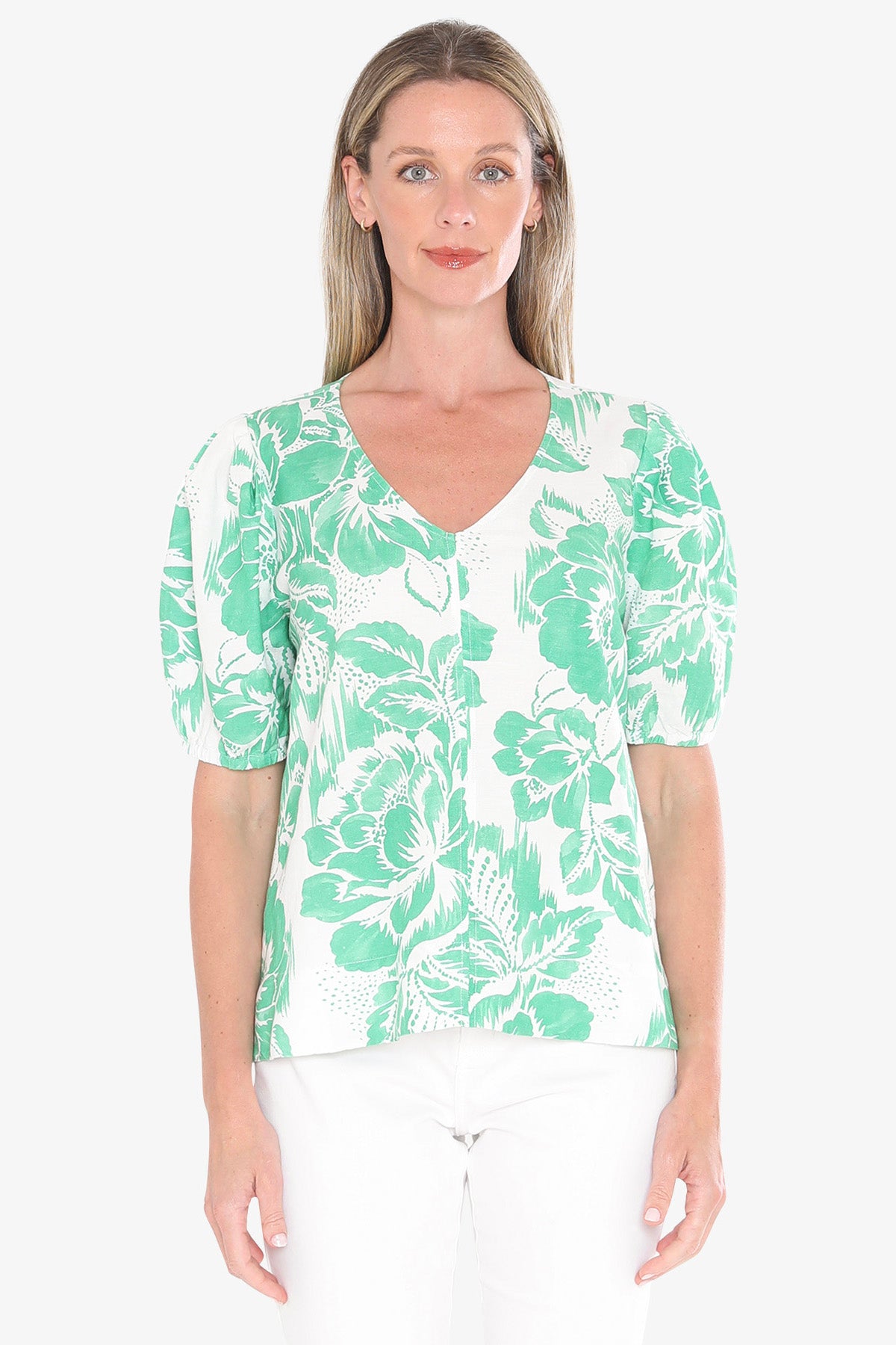 Tuscan Rose Printed V Neck Top, short sleeve with soft elastic band, relaxed fit, side splits.