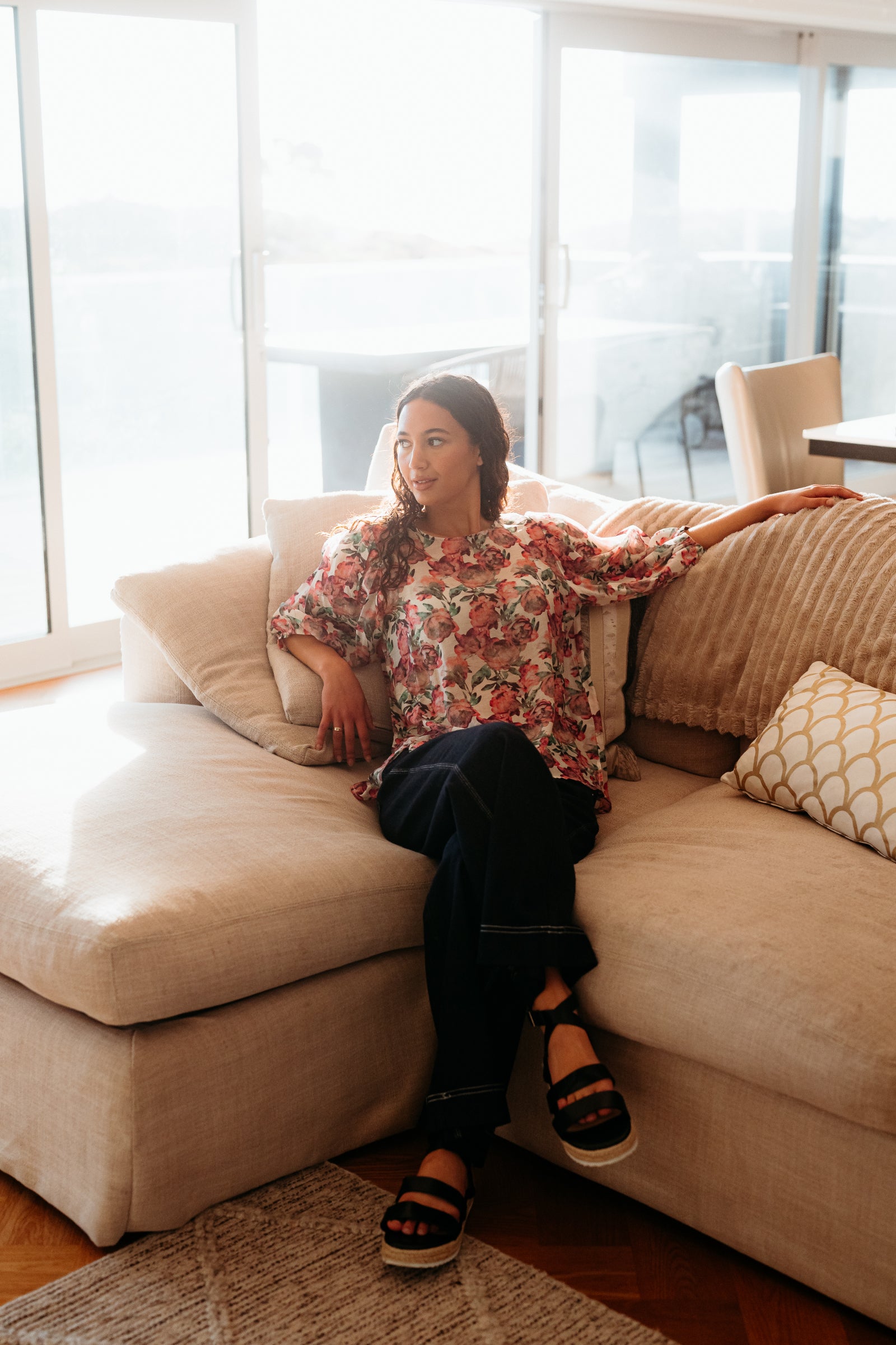 Staple Ariel Top with its three-quarter lightly voluminous sleeves, button detailing on the back, and a stunning floral print, this garment is perfect for those summery days.