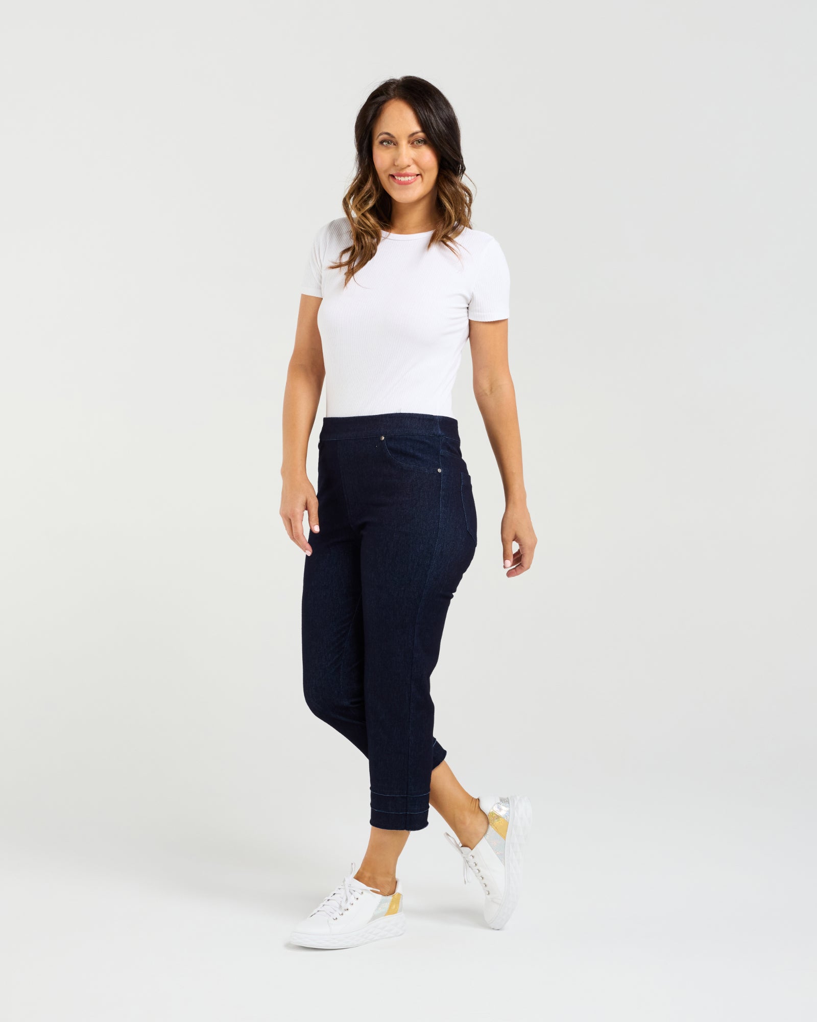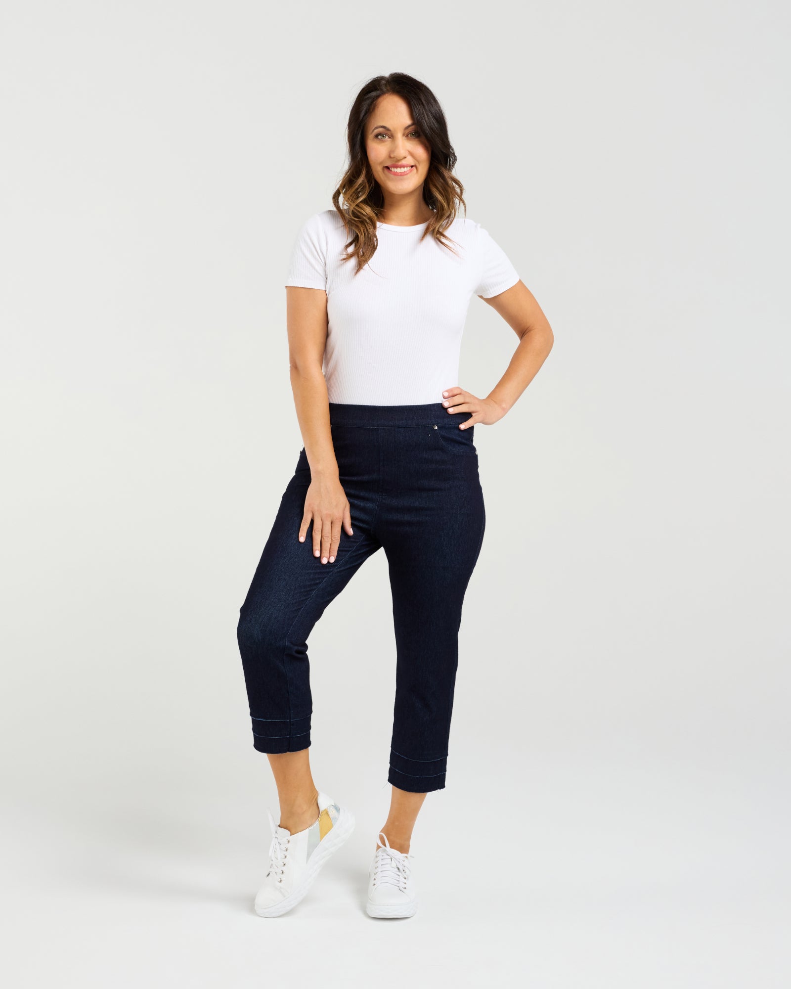 These fashion-forward 7/8 length pants feature a unique layered cuff detail with a frayed finish, adding a touch of edge to a classic silhouette. The cropped length highlights the ankle, making them perfect for showcasing statement footwear. Designed for a flattering fit, these pants blend casual cool with contemporary styling. Ideal for everyday wear or dressed-up casual looks.