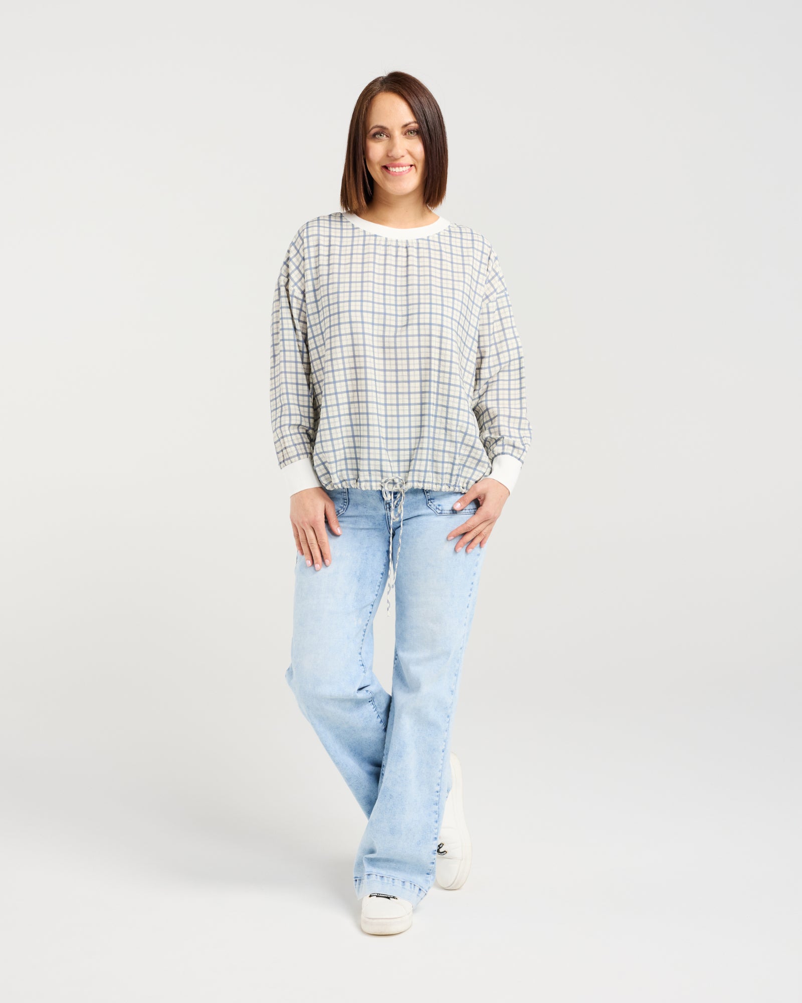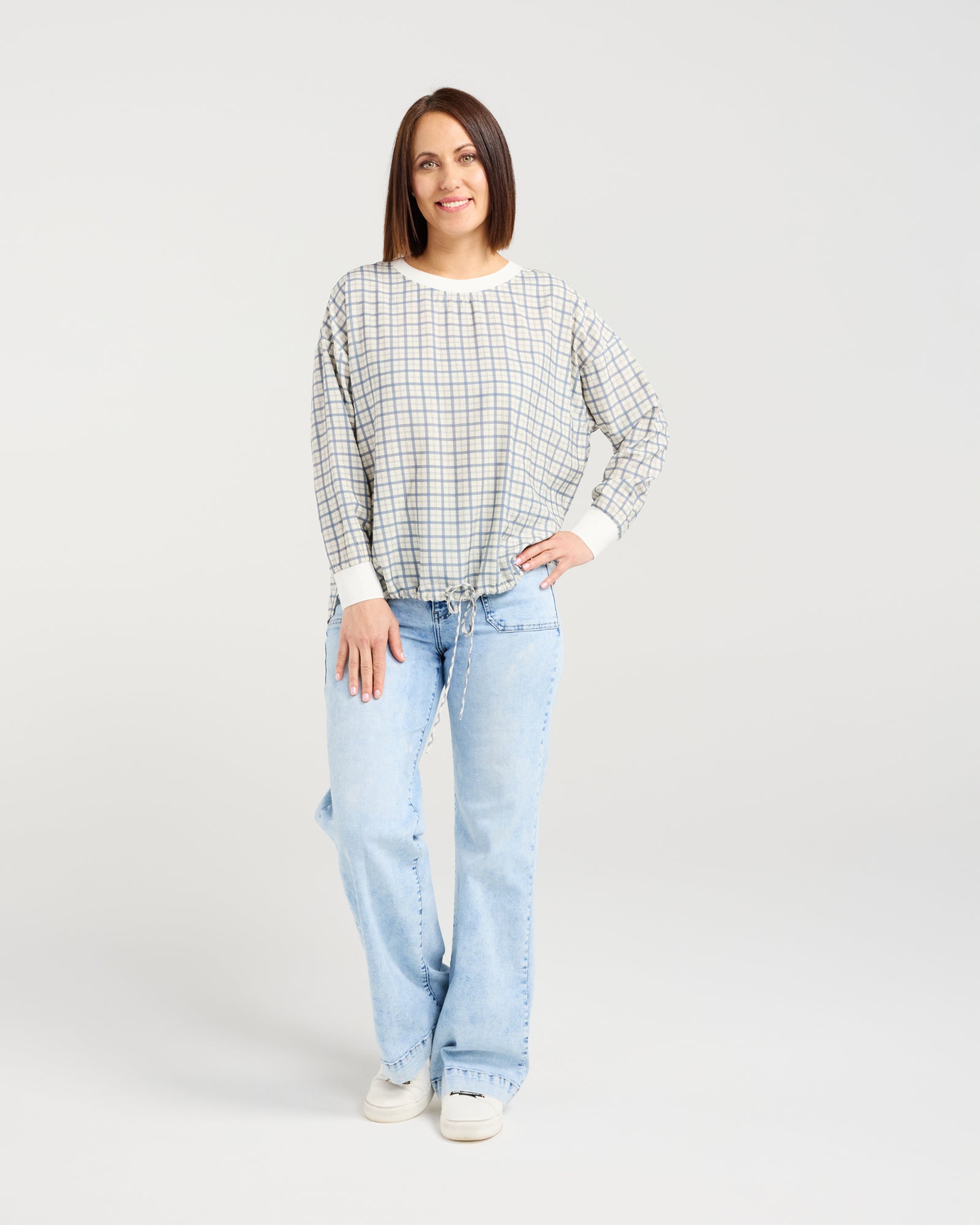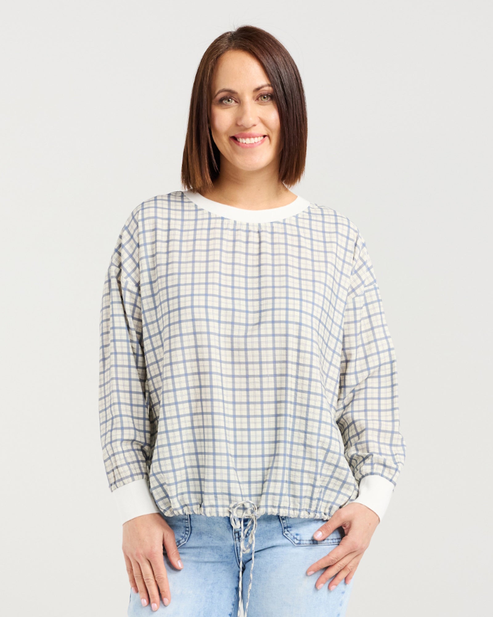 This long-sleeve top features elasticated arm cuffs, a slight side split, and a front hem drawstring for a relaxed, adjustable fit. Crafted in modern check fabric, it combines contemporary style with effortless comfort, perfect for winter layering.