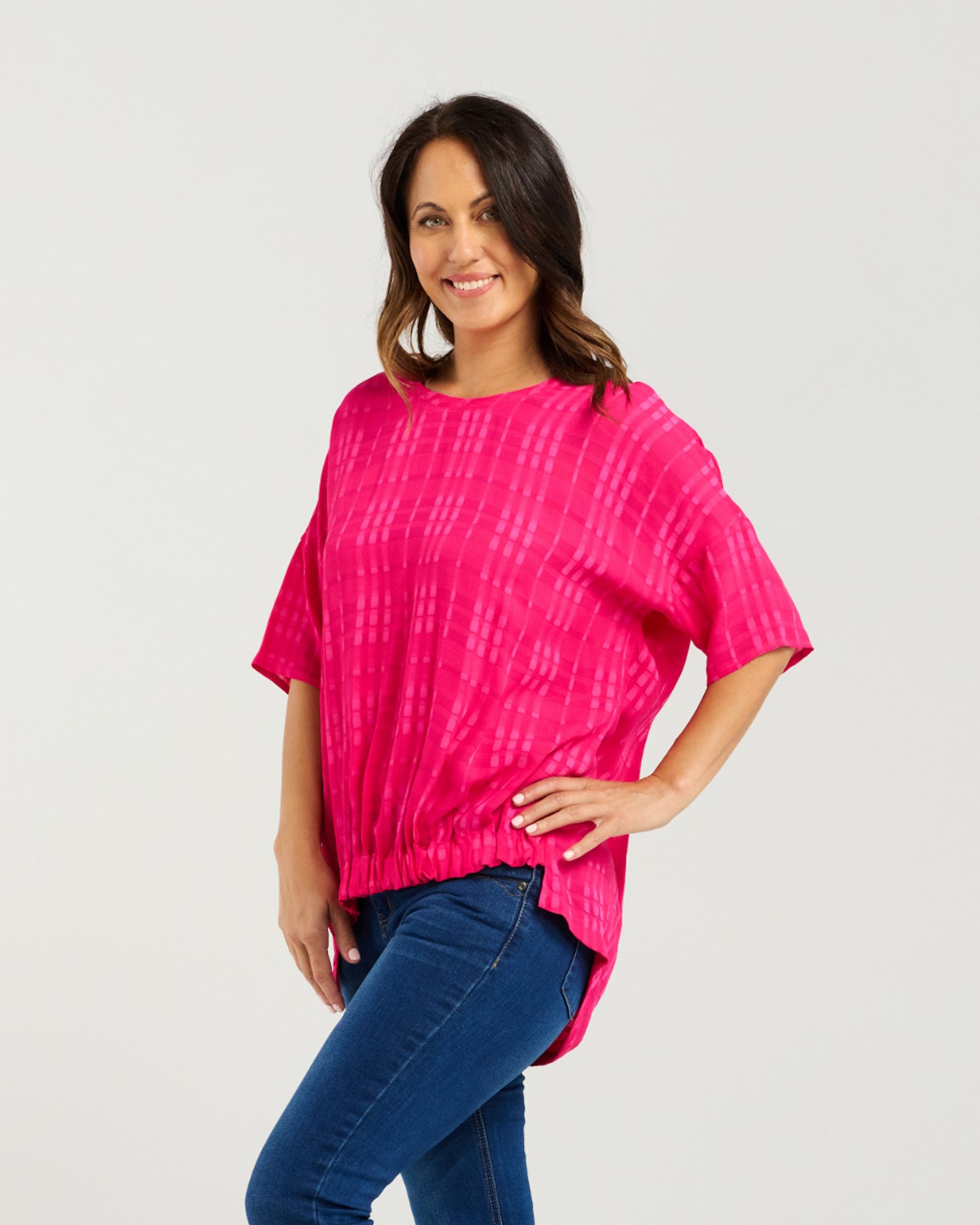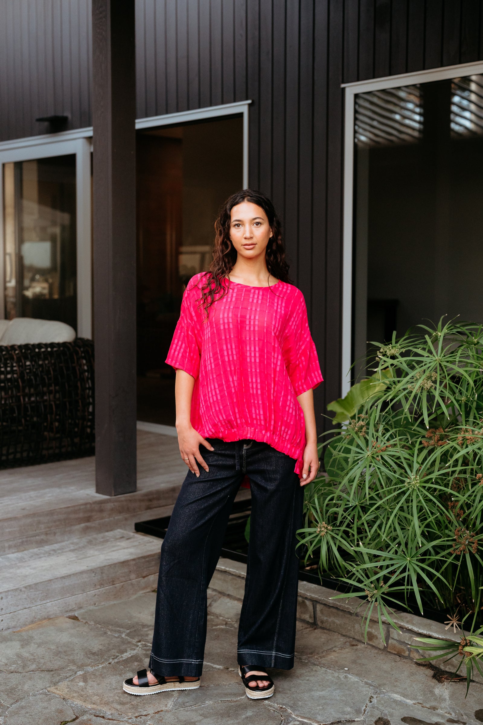 Our timeless top with a gathered front waistband and slightly longer finish in the back with a subtle plaid as an added detail.