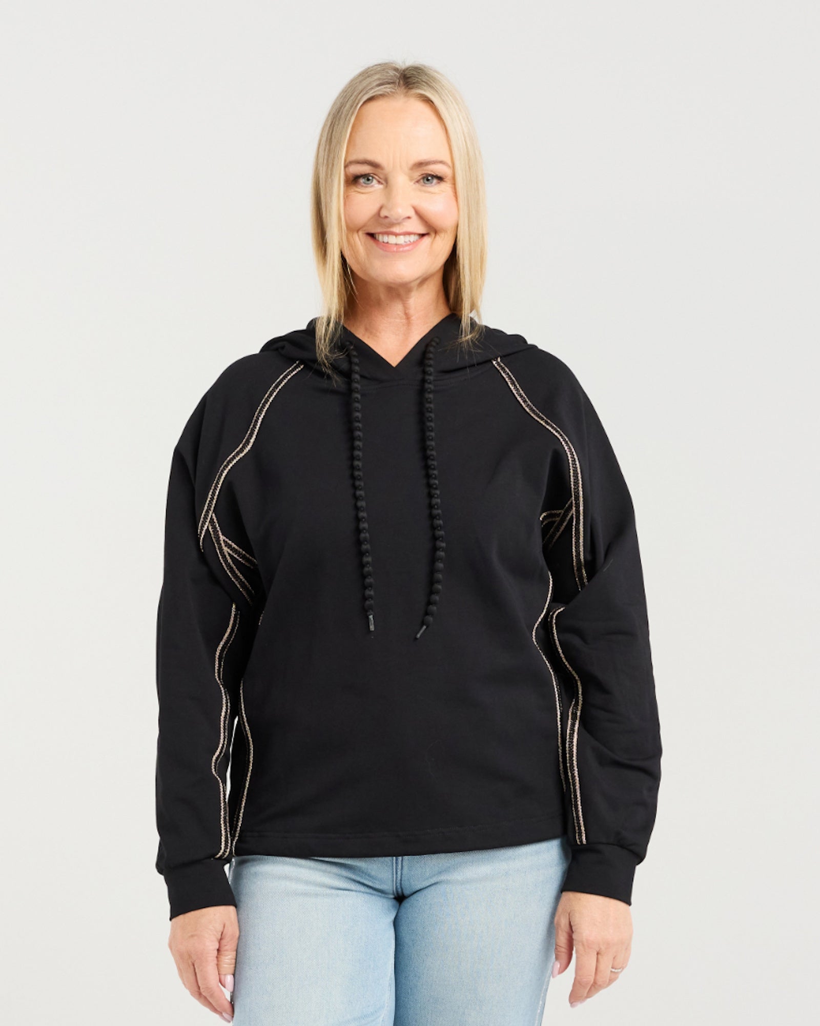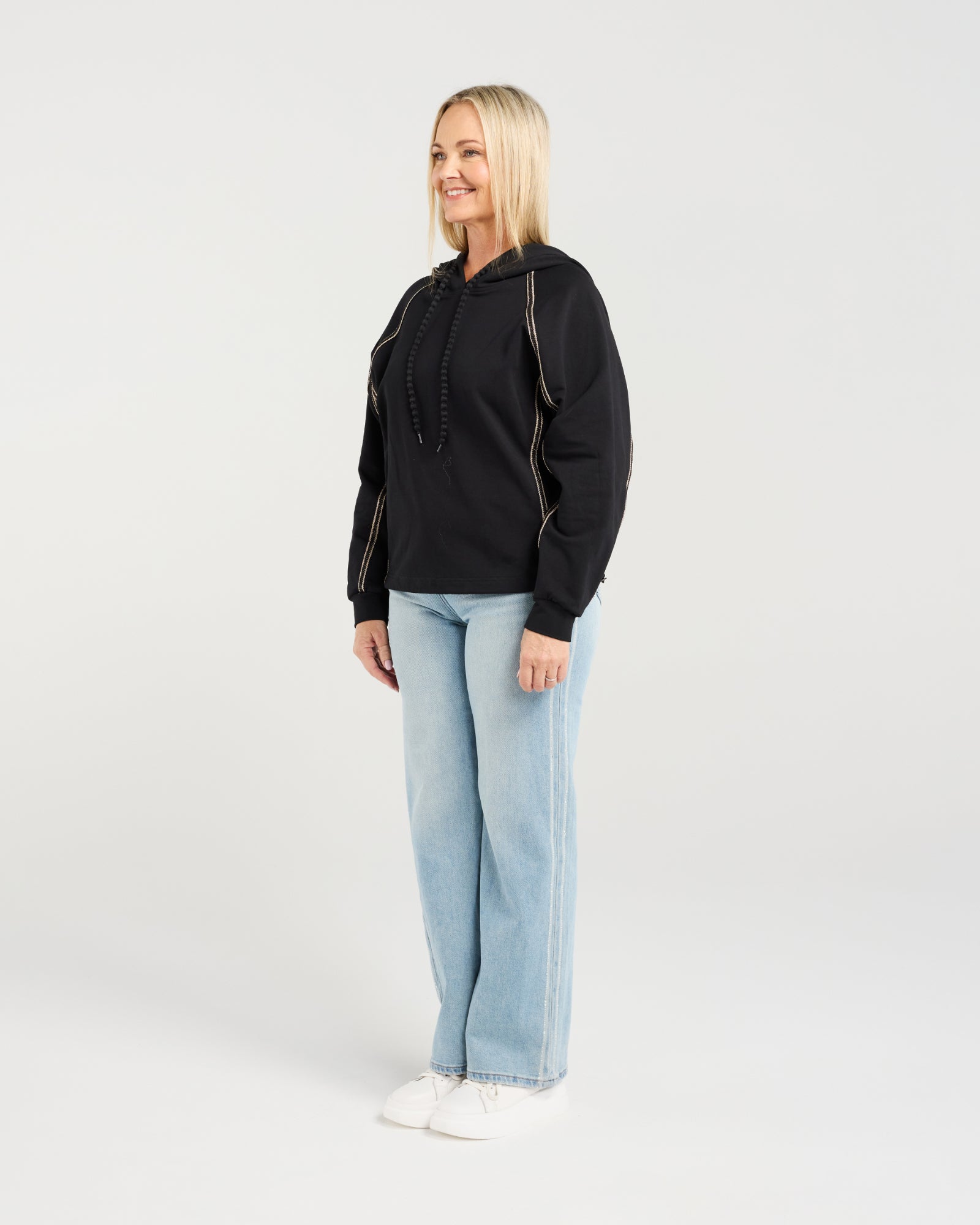 This hooded jumper features trim details along the sides and sleeves, adding subtle shaping and structure. A stylish tie at the hood completes the relaxed, contemporary look, making it a cool, versatile piece.