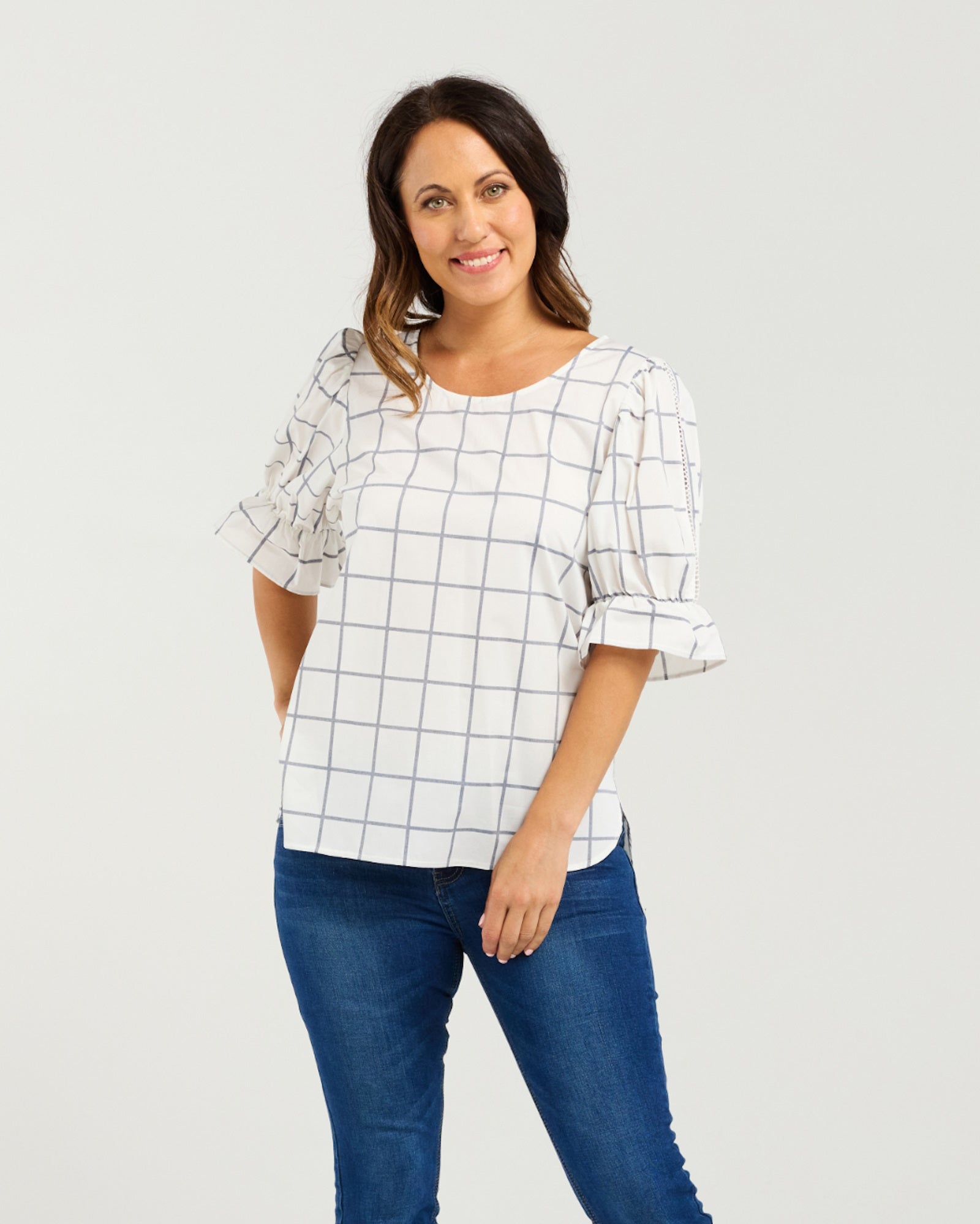 This playful top features a relaxed fit and a round neckline, offering a laid-back yet polished silhouette. The short sleeves are finished with frills, adding a touch of softness and movement. A subtle lace detail on the back introduces a hint of elegance and femininity. The design is completed with a graphic square pattern in grey tones, giving the piece a modern, structured appeal with a subtle edge.