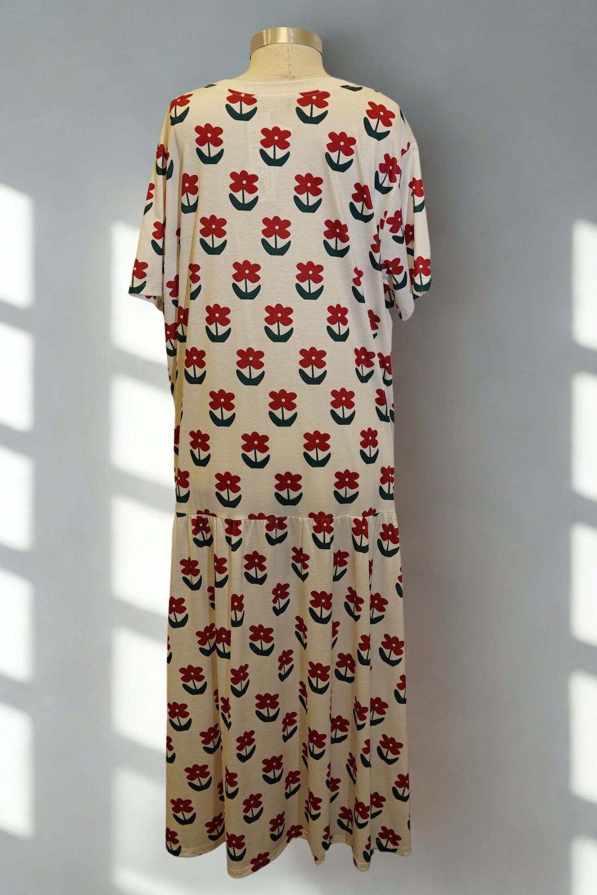 Crafted from 100% breathable cotton, this white short sleeve maxi dress features a relaxed drop waist silhouette adorned with a blooming floral print that brings charm and color to every step. Perfect for garden parties, weekend strolls, or sun-soaked getaways.