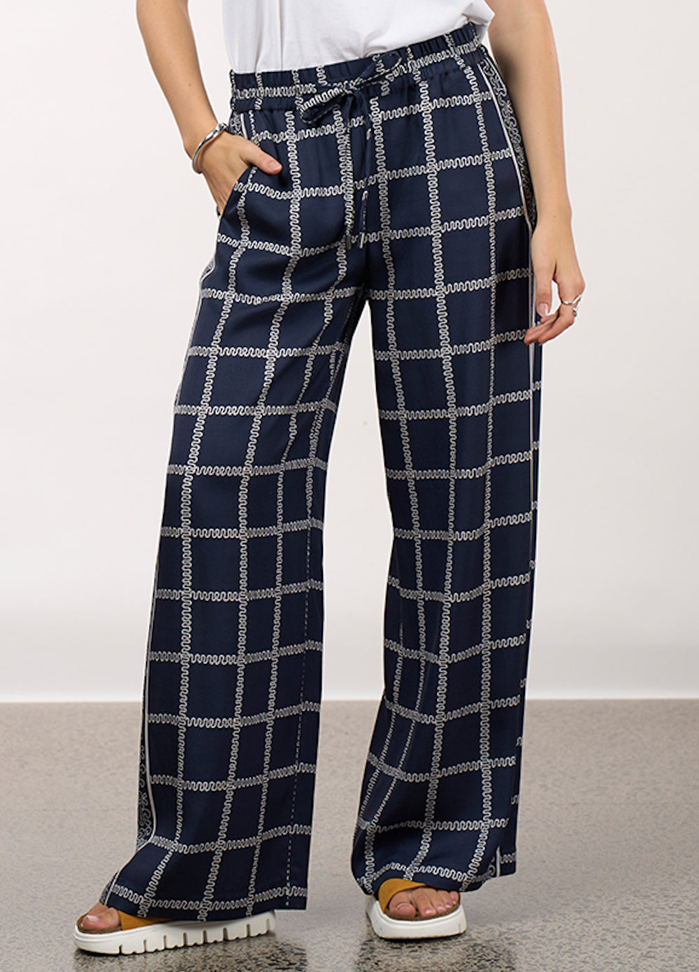 Relaxed fitting printed pant, with front pockets and an elasticated waistband, with a contrast print border at side seams.