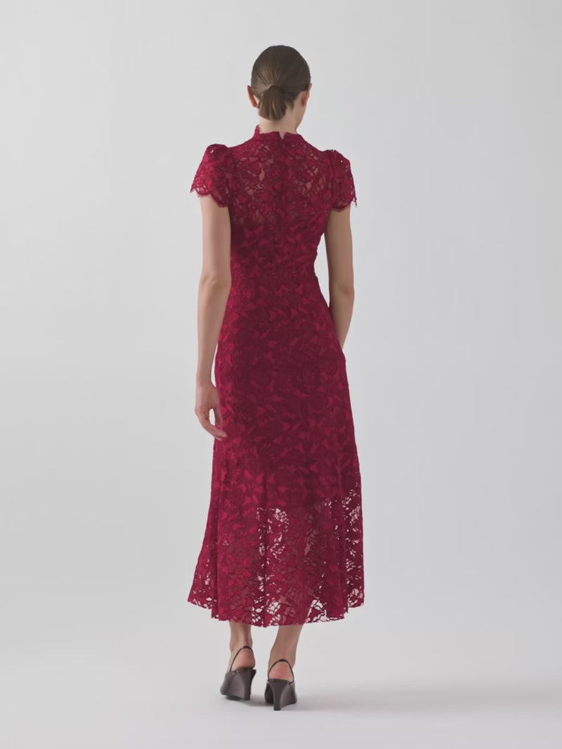 he Carmen Midi Dress embodies refined elegance in luxurious corded two-tone red velvet lace. Designed with a soft high neckline and delicate cap sleeves, the silhouette is fitted through the bodice before falling into a flattering midi length A-line skirt, creating graceful movement. A sophisticated choice for evening events, formal occasions, and special celebrations.