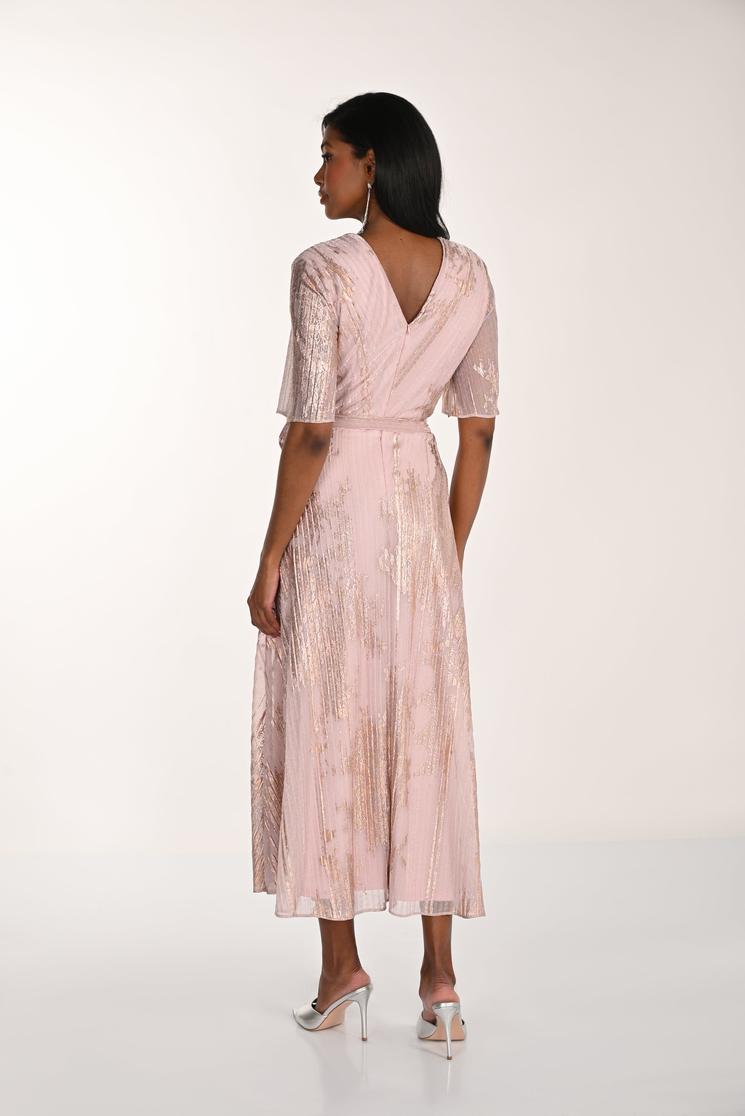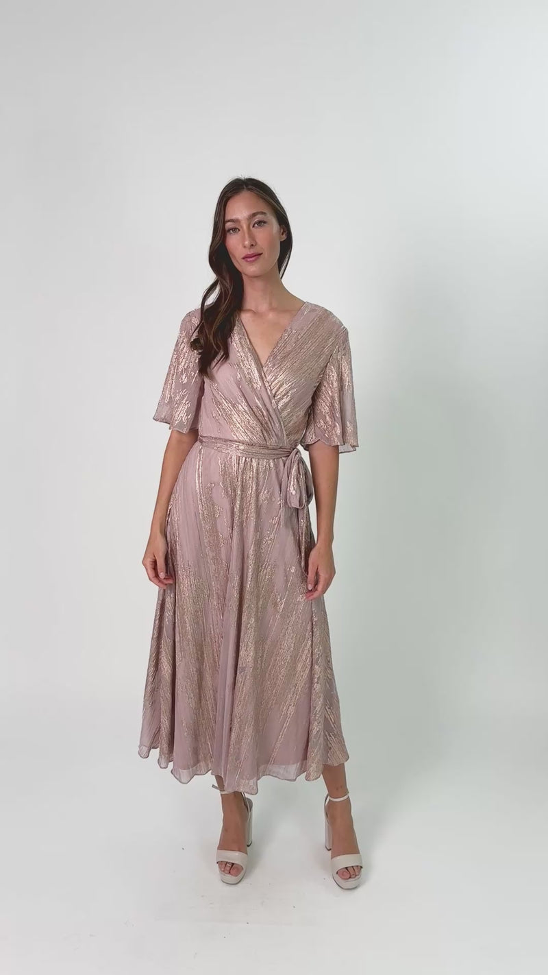 Embrace sophistication with the Frank Lyman midi wrap dress. This elegant piece features a belted waist, creating a flattering silhouette. The V-neckline and plain pattern add a touch of timeless charm, while the short, flutter sleeves provide a delicate, feminine flair. Perfect for formal, semi-formal, or night-out occasions, this dress effortlessly combines style and grace.