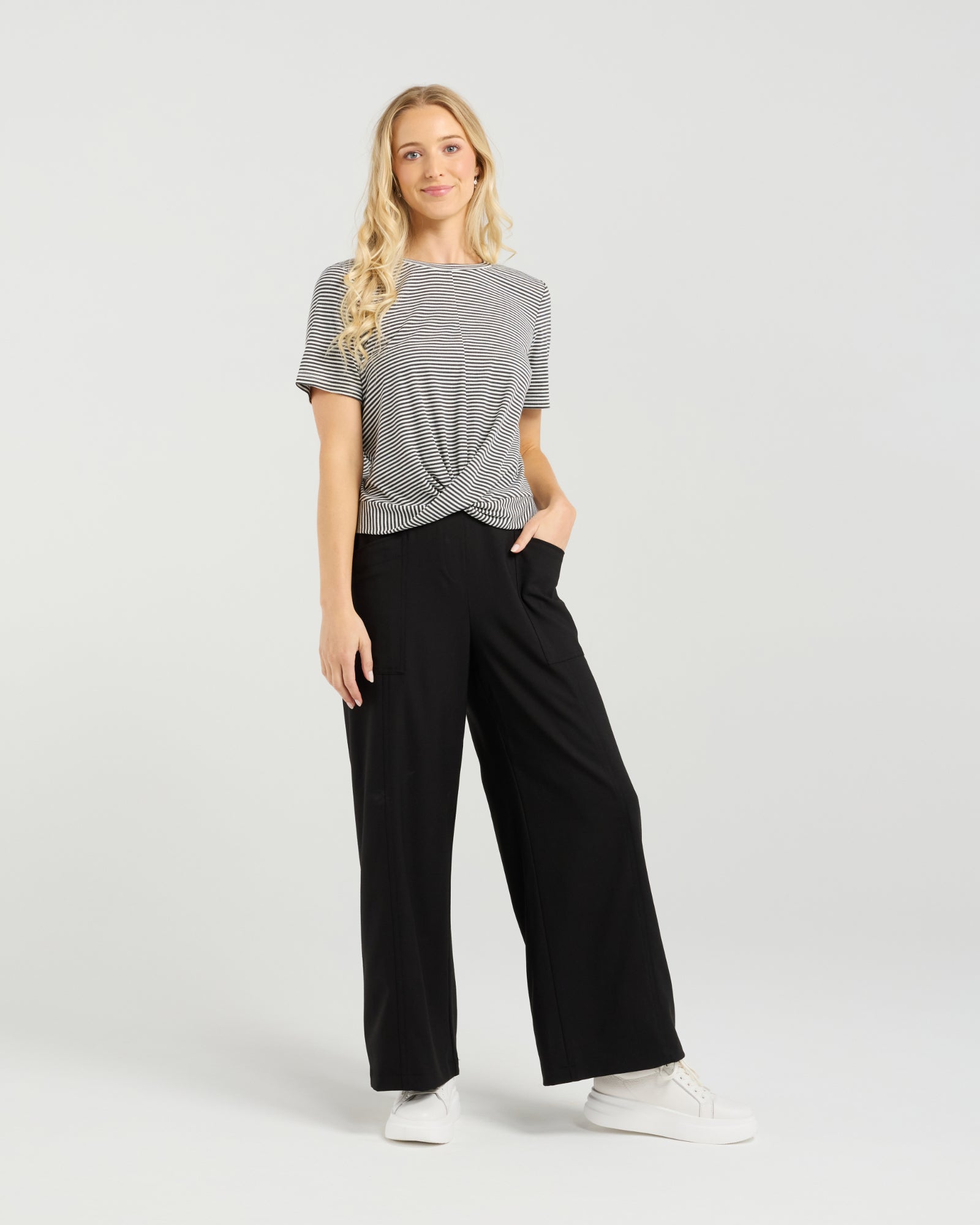 A must-have top for summer, perfect back with denim, high waisted wide leg pants, and trendy midi-skirts. Made out of Cotton blend rib knit and featuring round banded neckline, and a flattering twisted detail on the front, this is sure to become your go-to tee for summer.