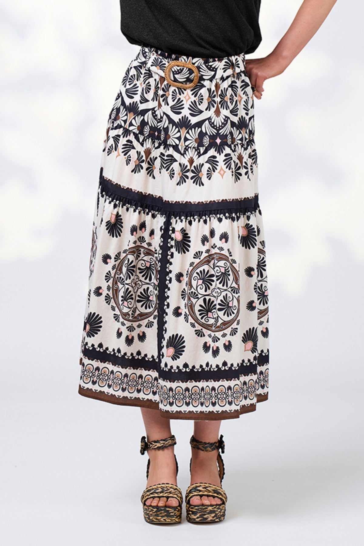 Floaty, pull-on tiered skirt with an elasticated waistband. Featuring a self belt with a rattan buckle. Fully lined.