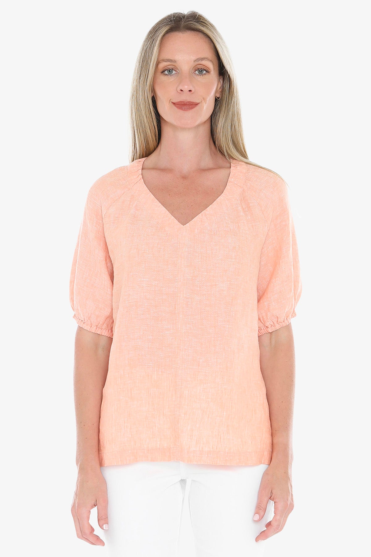Ruched V-Neck Linen Top - 100% Cross - Dyed Linen, elbow length raglan sleeve, soft elastic-gathered cuff.