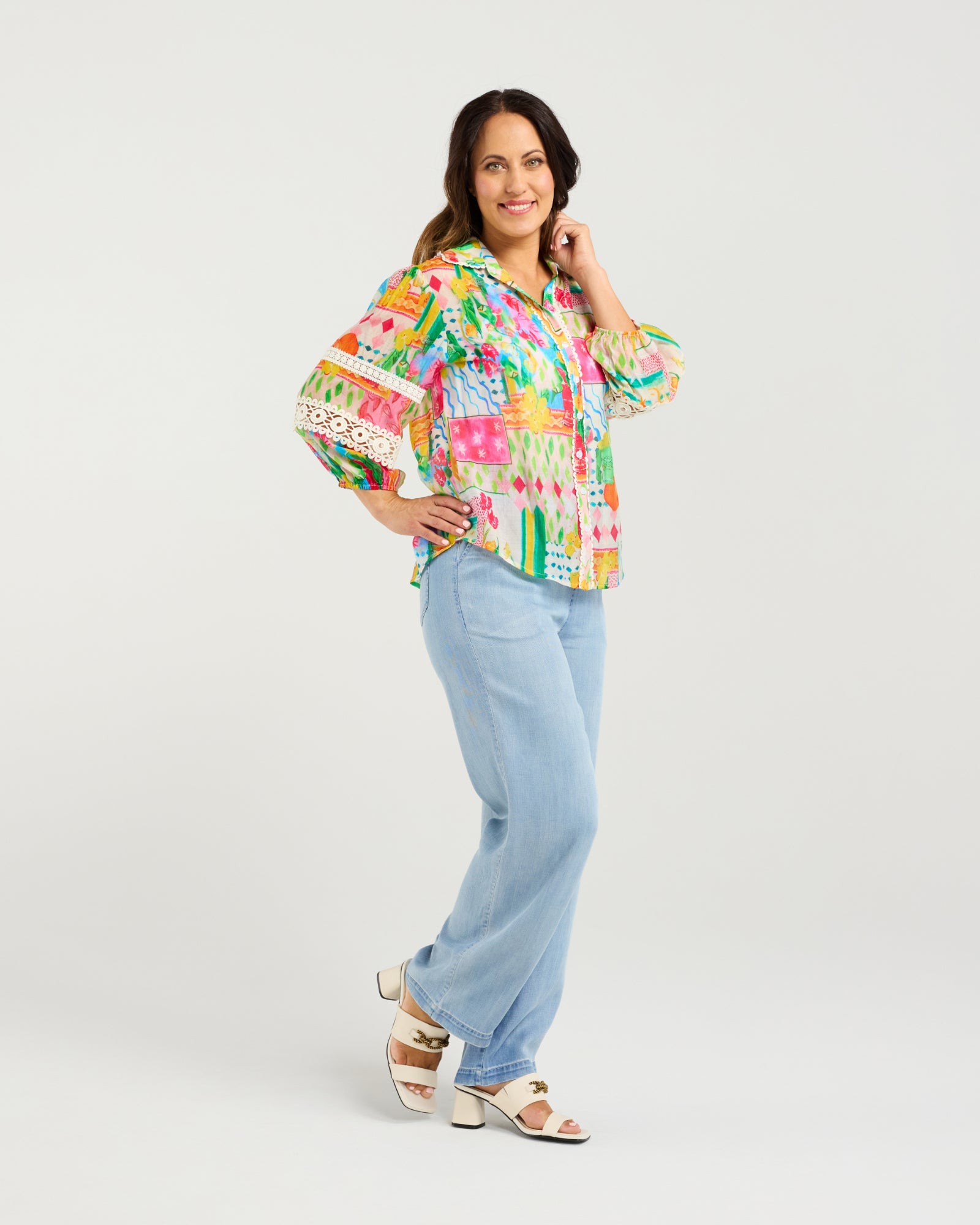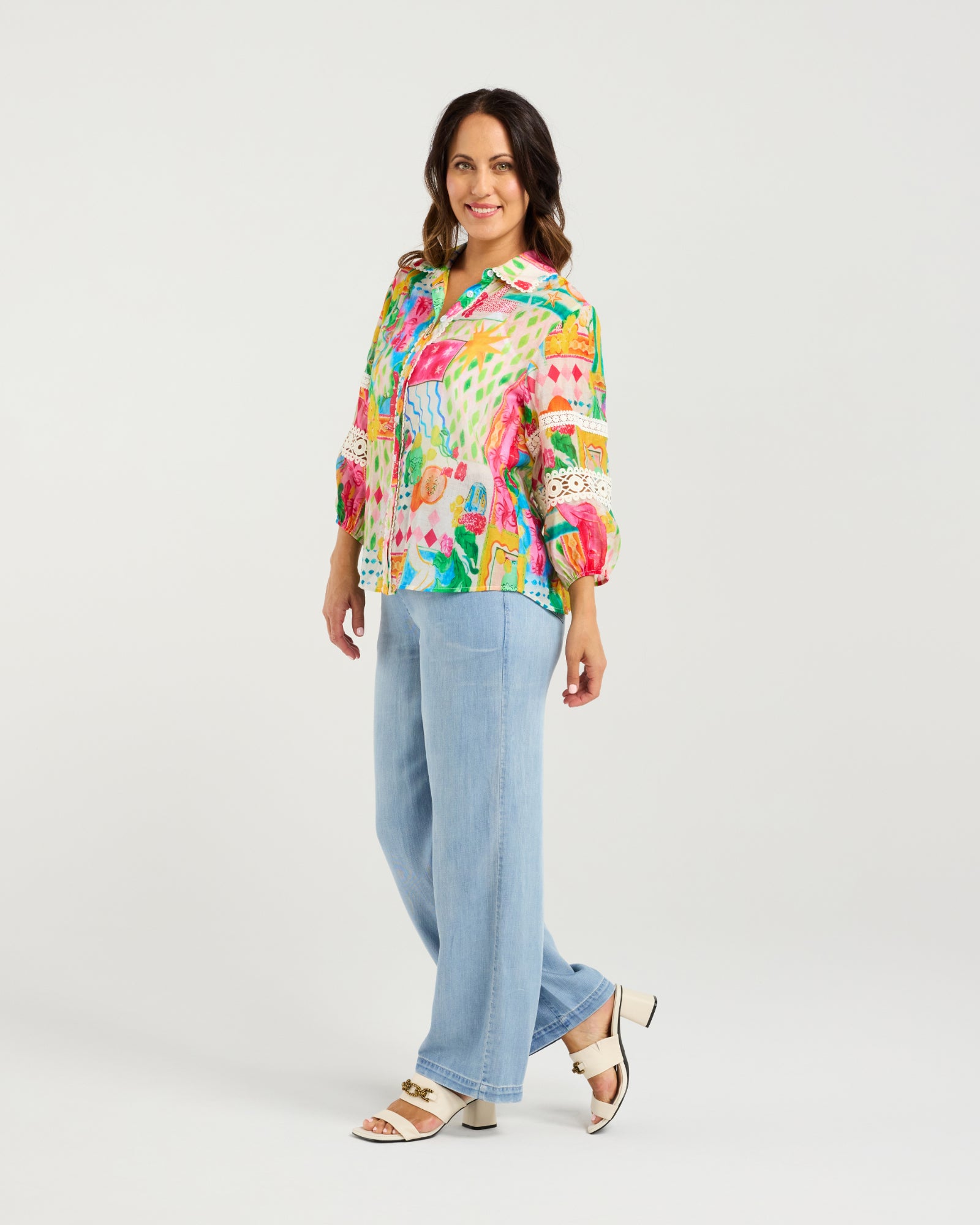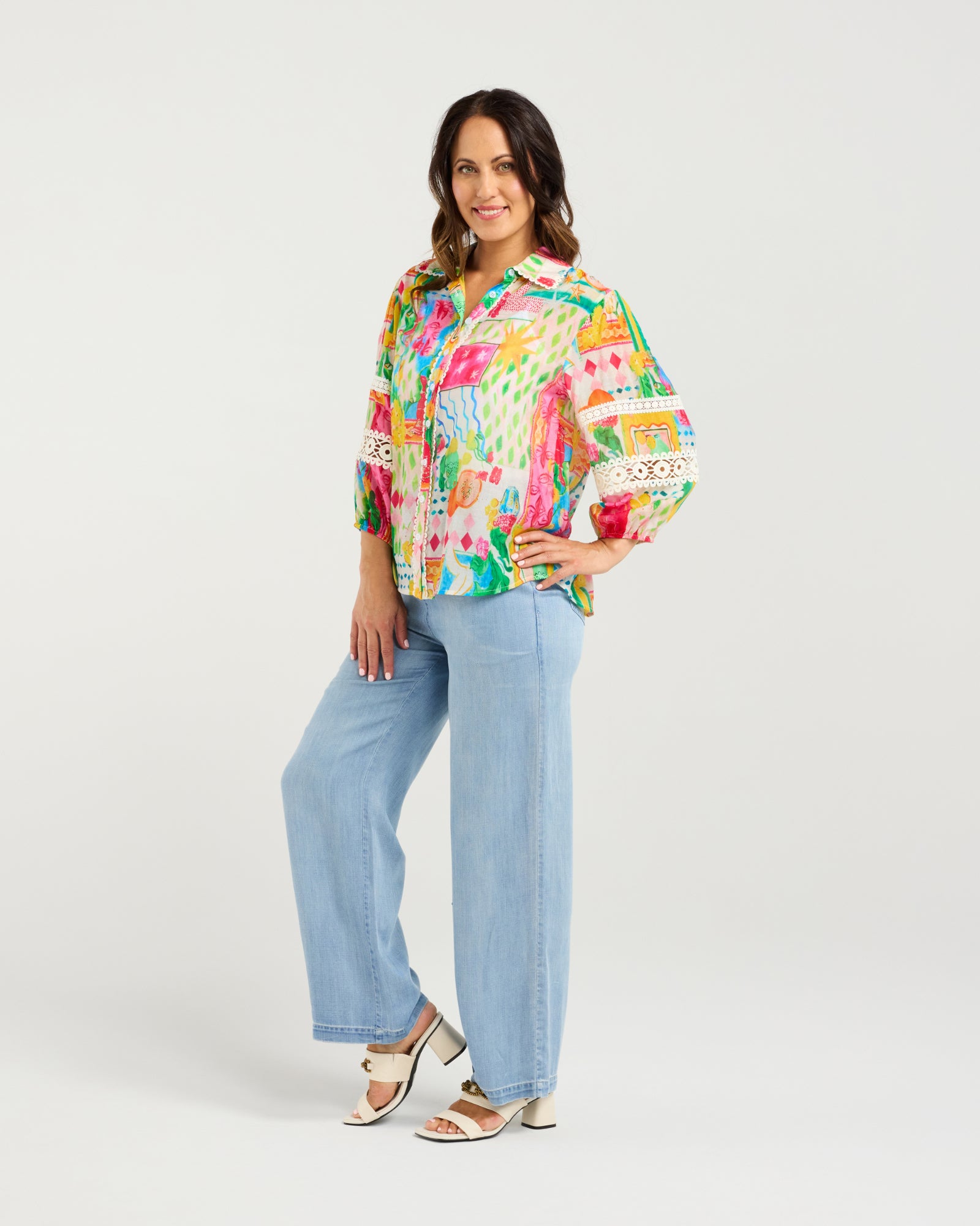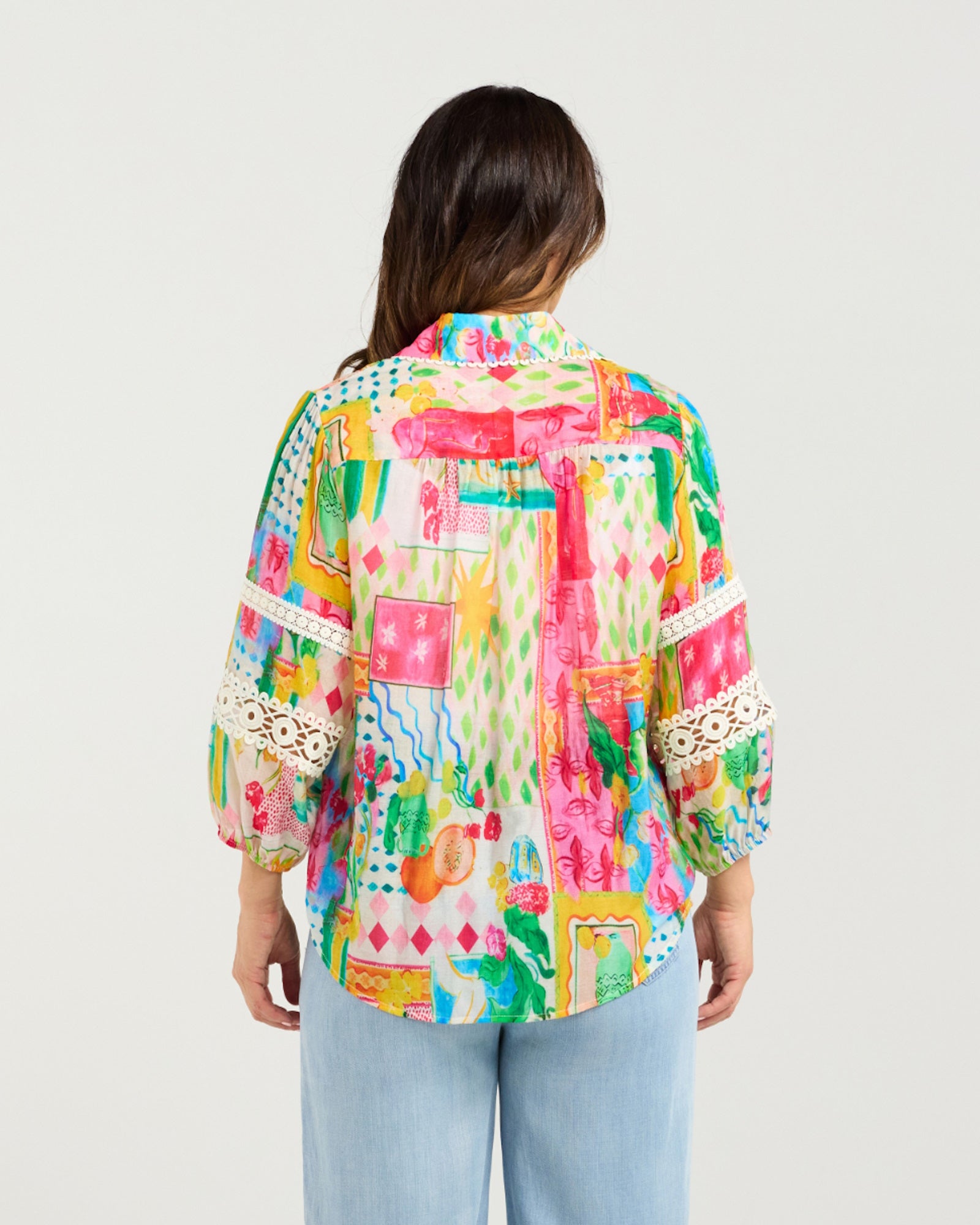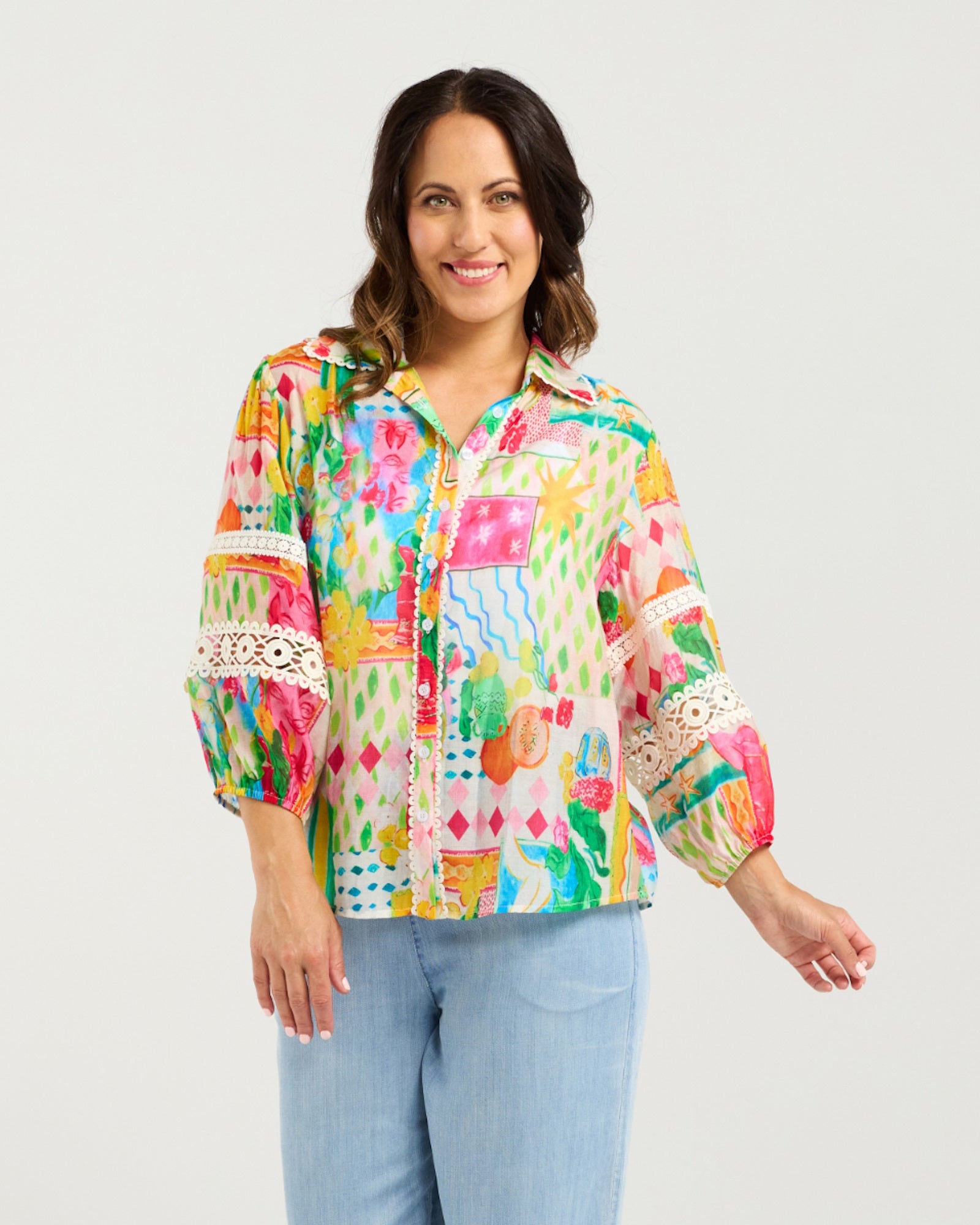 This elegant button-down shirt features a classic collar neckline and puffed 3/4 sleeves with elasticated cuffs, adorned with delicate lace inserts. The small scalloped trim around the collar and button stand adds a refined touch to this timeless, feminine piece.
