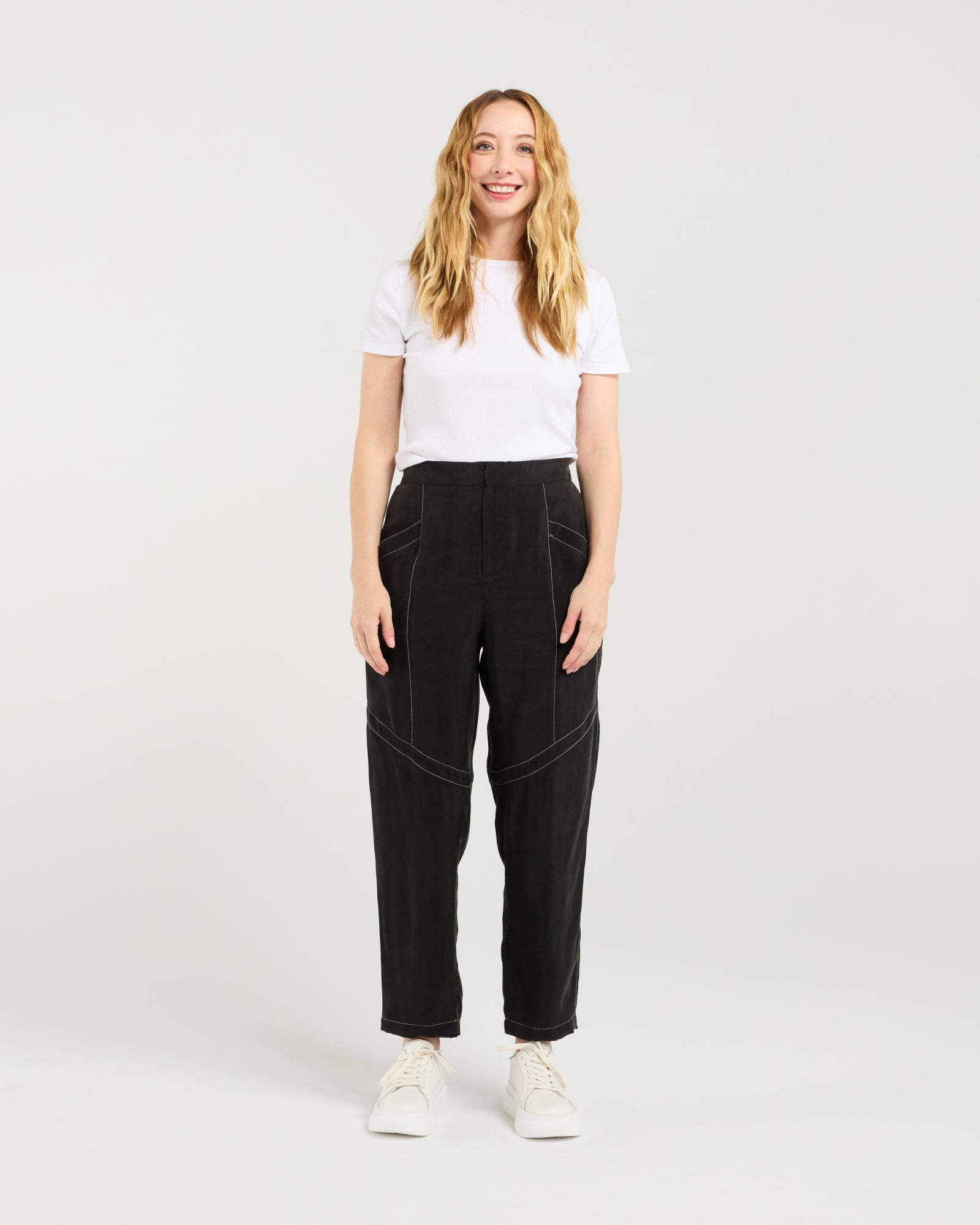 These pants feature an elasticated back for a comfortable, easy fit. The unique panel design adds an interesting touch, while the super-soft fabric ensures a relaxed and luxurious feel, making them perfect for both casual and elevated looks.