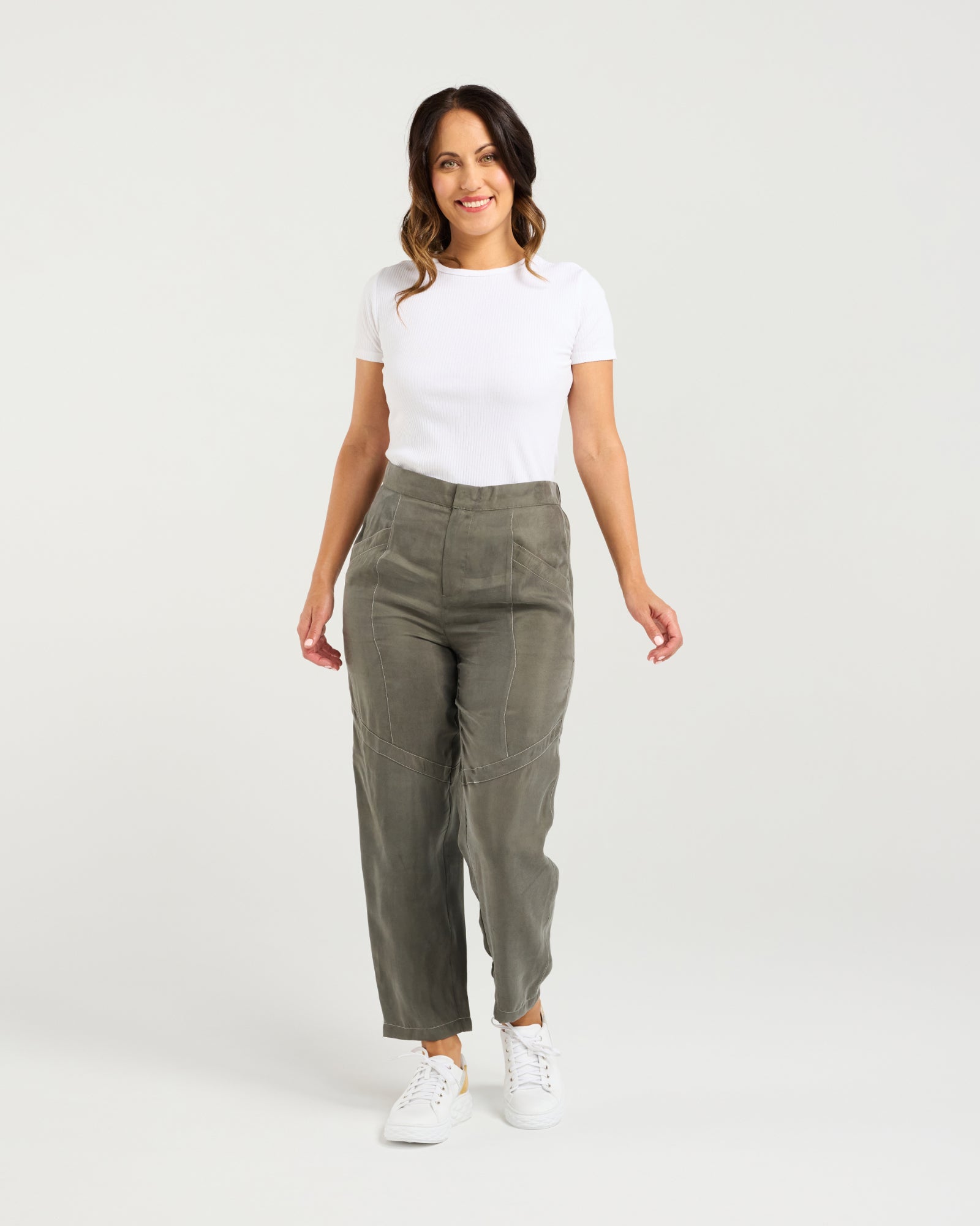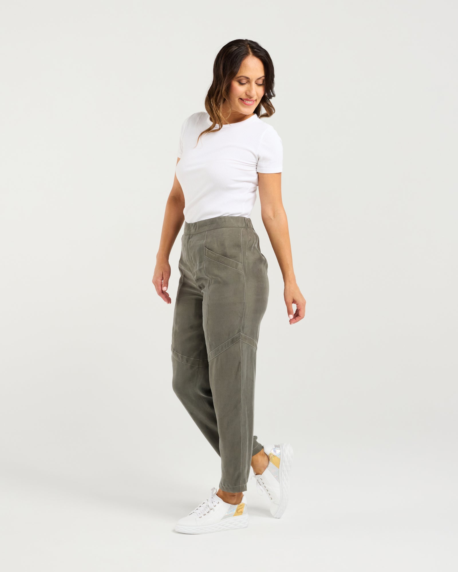 These pants feature an elasticated back for a comfortable, easy fit. The unique panel design adds an interesting touch, while the super-soft fabric ensures a relaxed and luxurious feel, making them perfect for both casual and elevated looks.