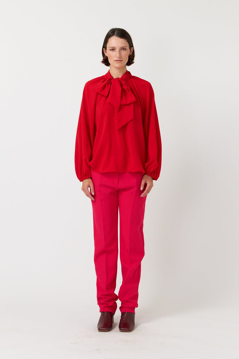 Made in New Zealand, the Marcel blouse offers a sophisticated yet relaxed approach to winter dressing. It ties in an oversized bow at the neck and has billowy long sleeves that gather into a bound cuff.