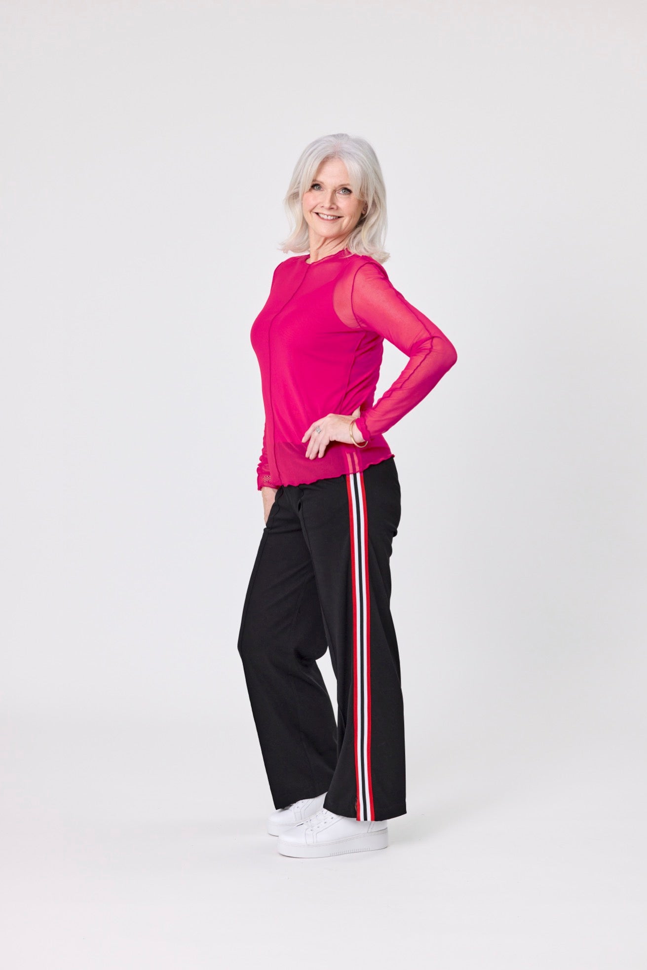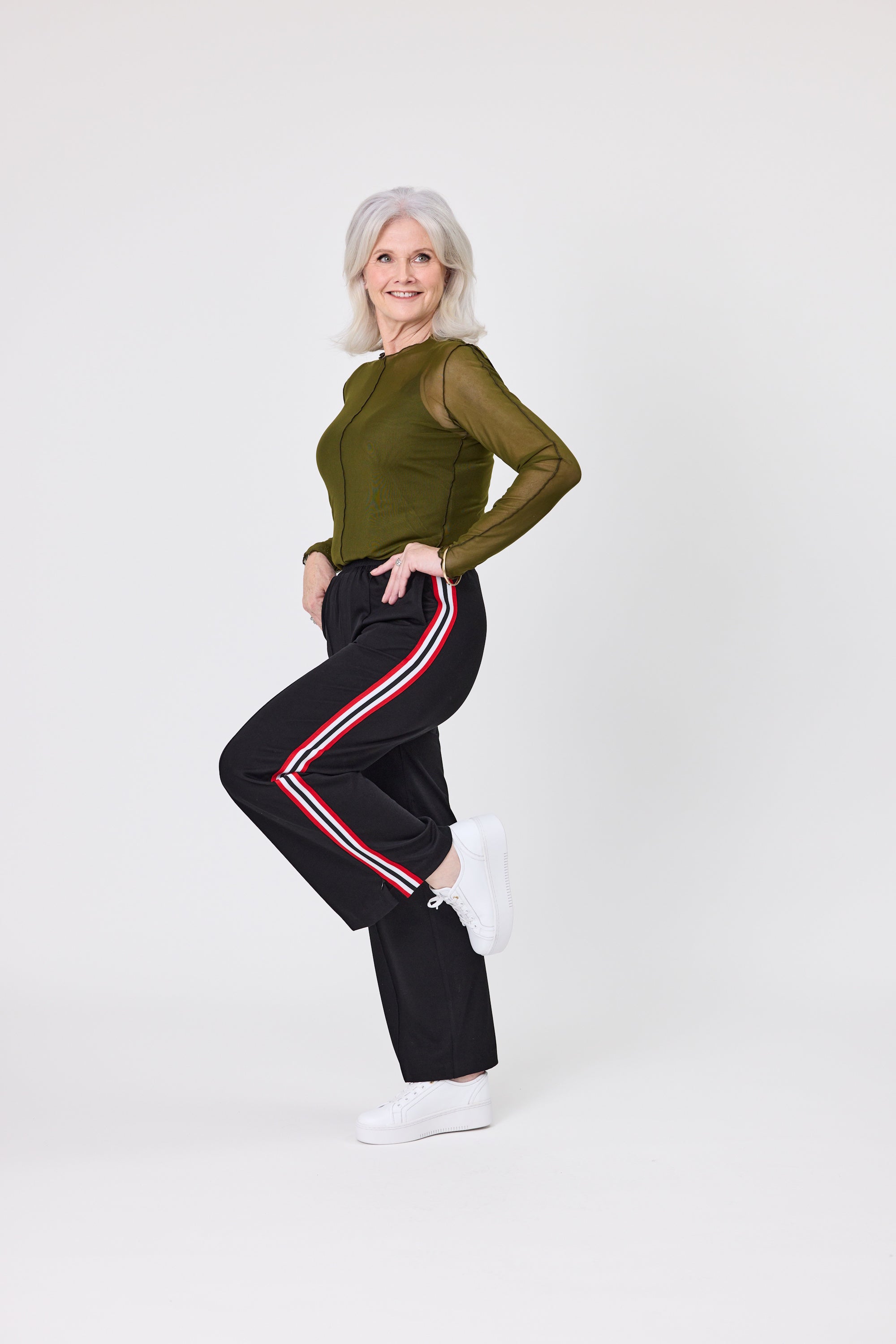 • Full length pants they feature a wide cuff hem. Sporty, track-pant design with