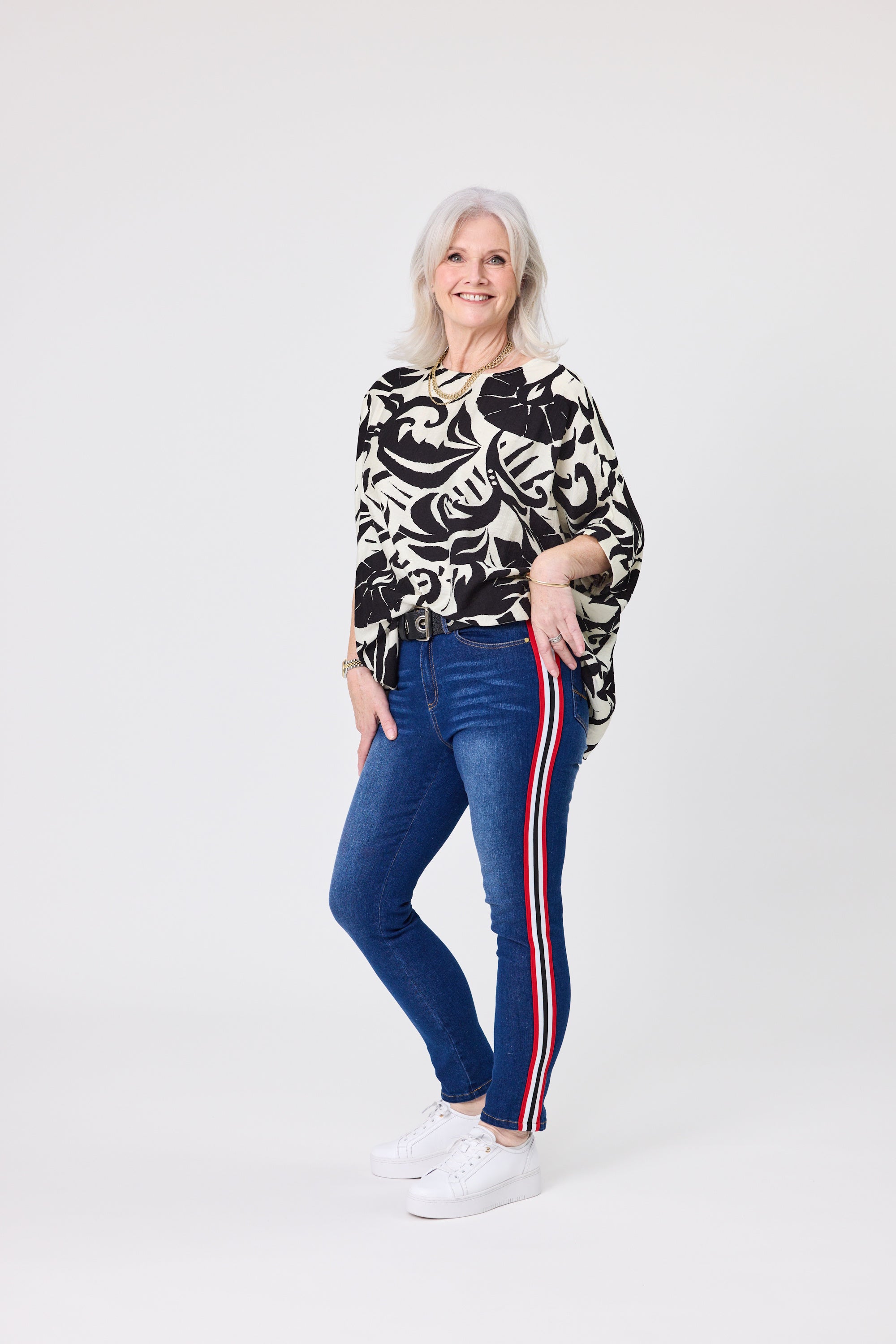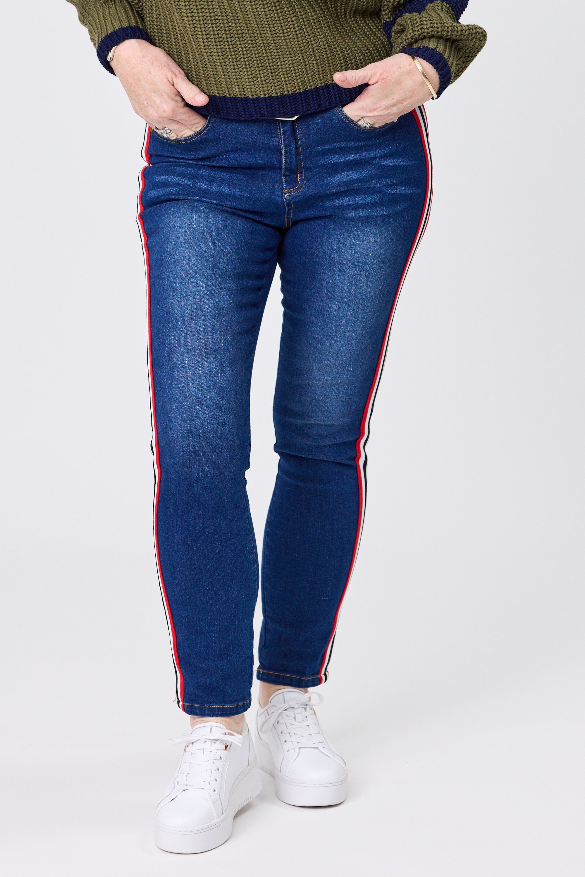 • Slim fit denim pants with a prominent sporty aesthetic.