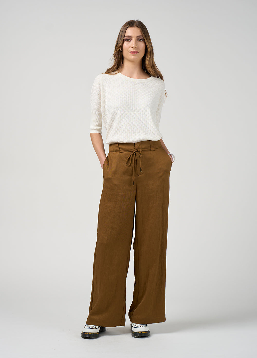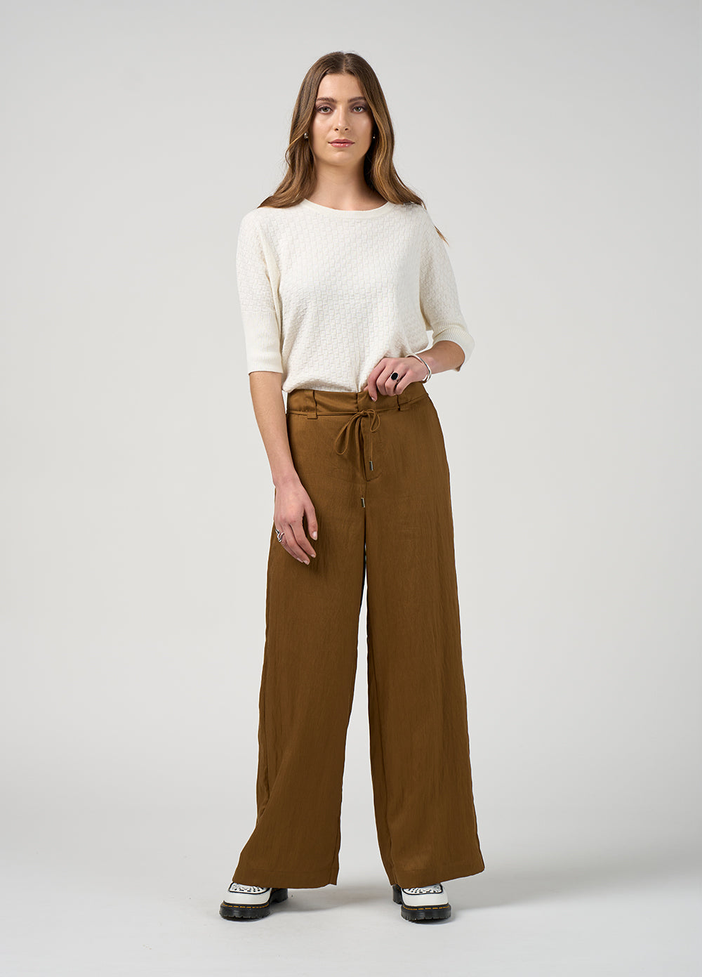 A wide leg pant with a fly front, elasticated back waist and functional in-seam pockets, featuring a waist tie with fine metal toggles and a single back pocket.