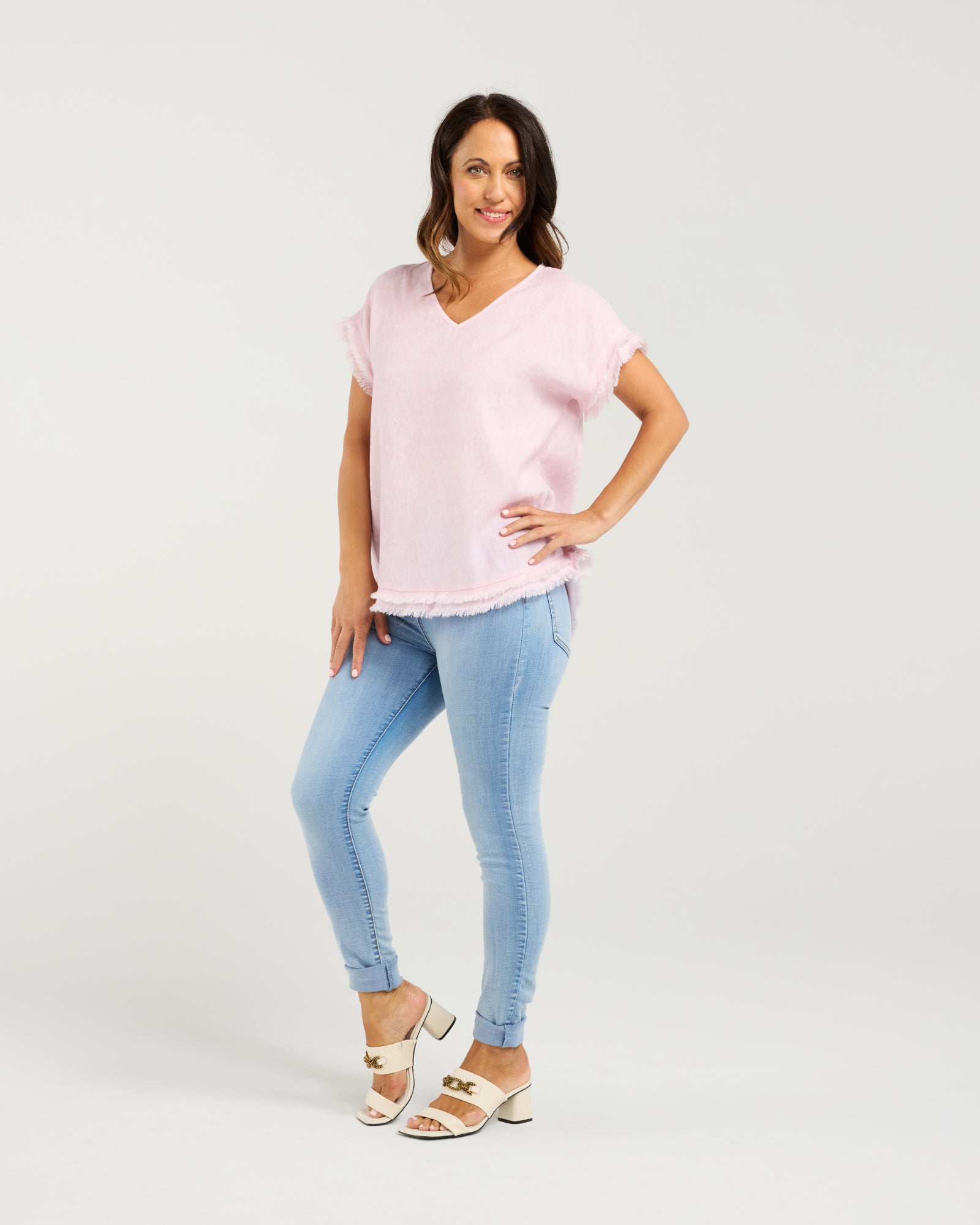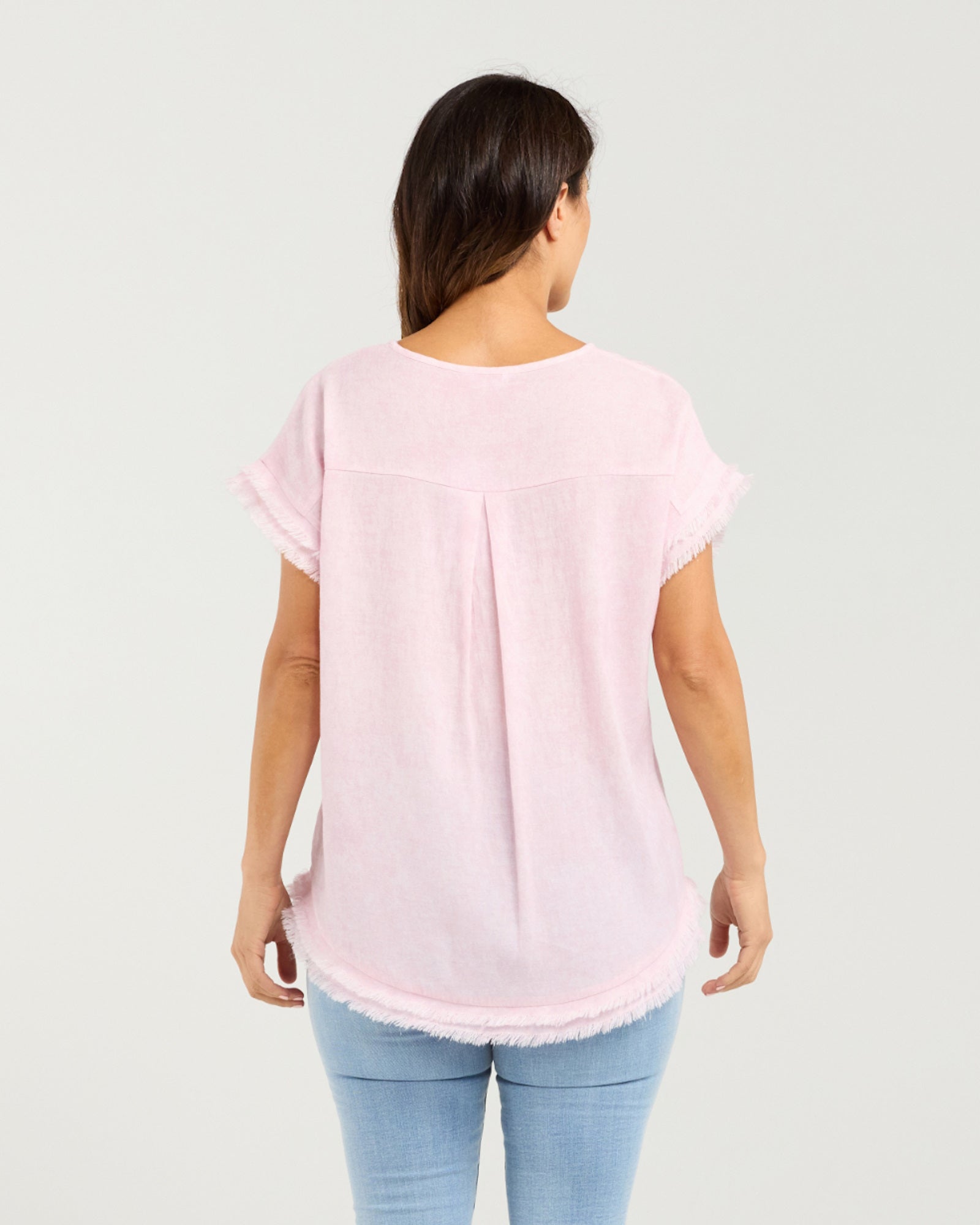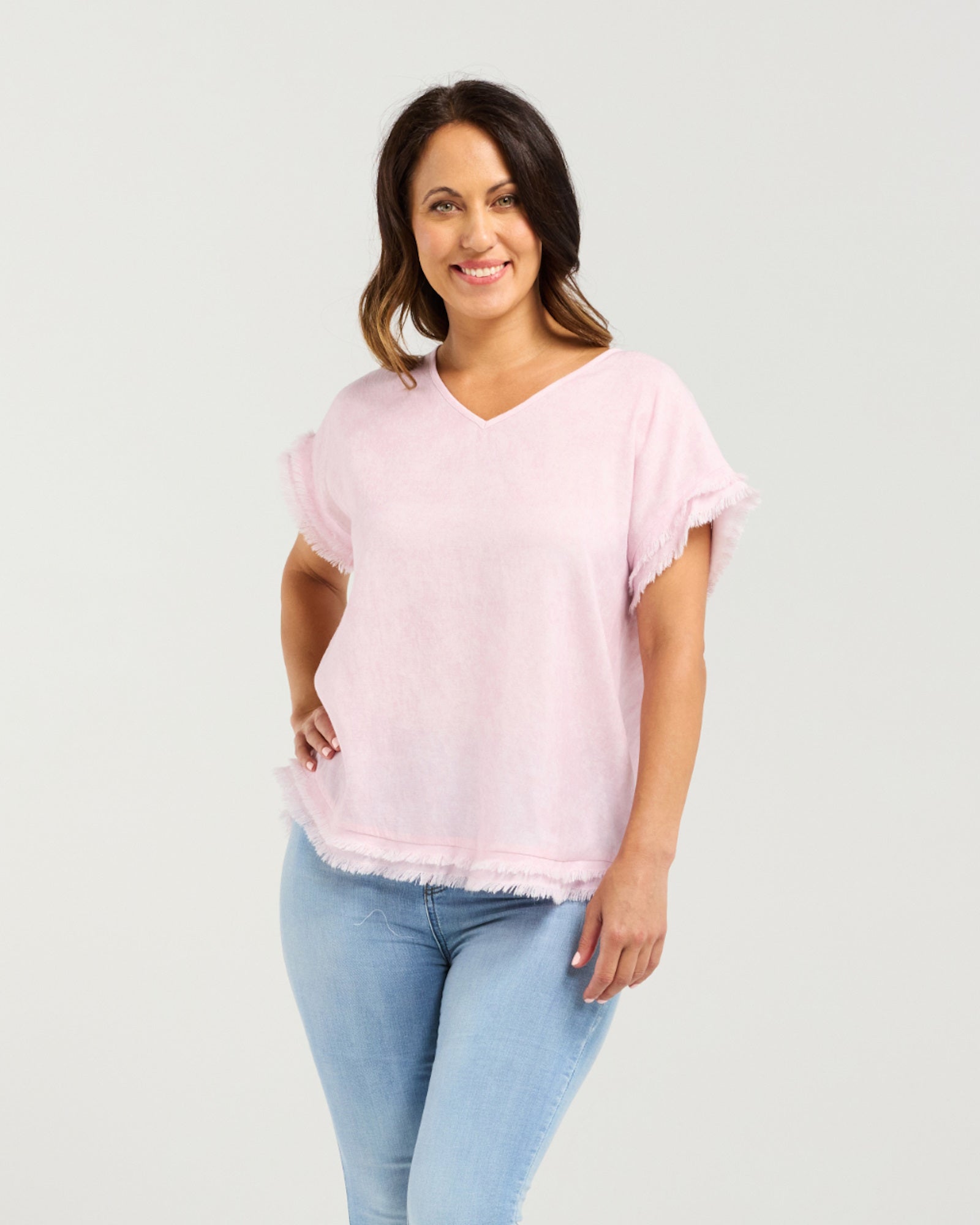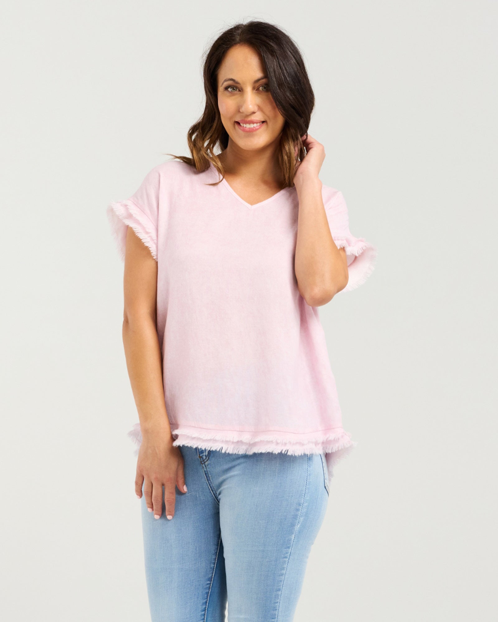 This soft pink V-neck top blends simplicity with subtle texture. Short sleeves and a gently relaxed fit make it an easy everyday piece, while frayed detailing on the cuffs and hem adds a lived-in, romantic edge. The raw finishes give it a casual elegance, perfect for layering or wearing solo on breezy days.